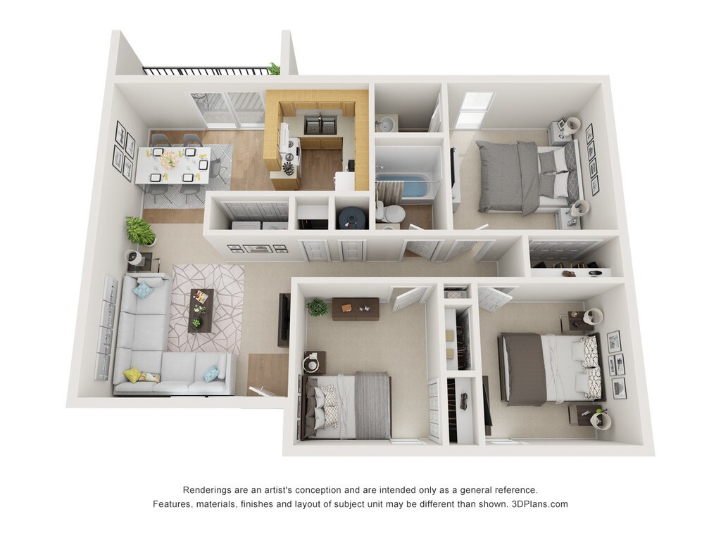 Modelo de apartamento: Two Bedroom$1,0002 Dormitorios, 1 Baño, 848 sq ftDisponible AhoraTwo Bedroom - Plano 1 3 Dormitorios