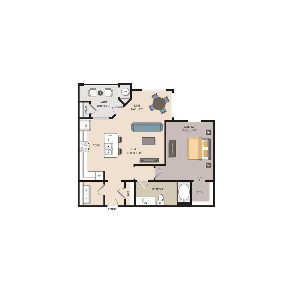 1 Dormitorio, 1 Baño, 630 pies²Disponible AhoraGalería del Modelo