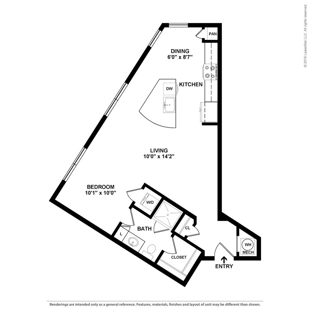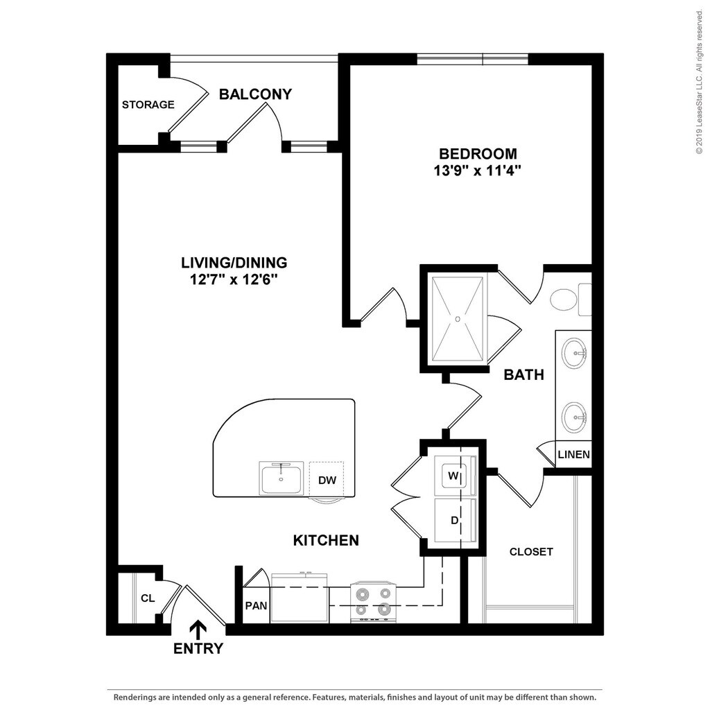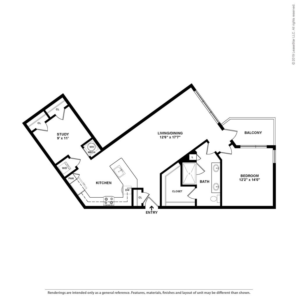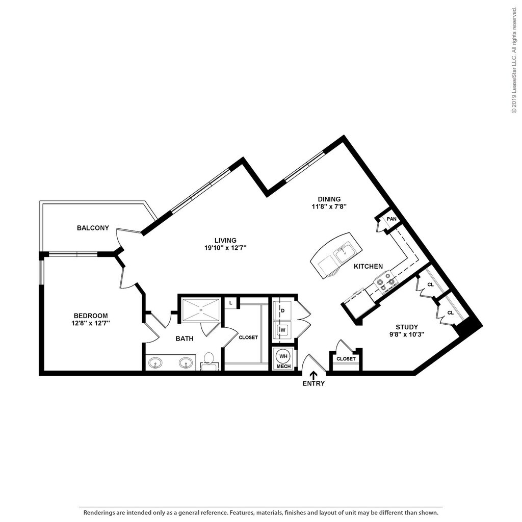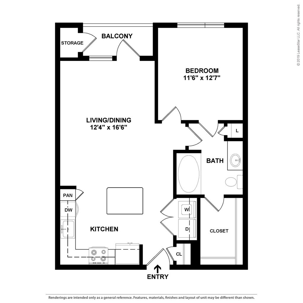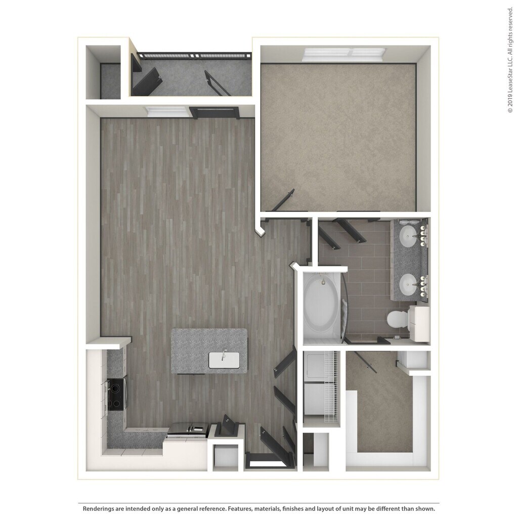 Modelo de apartamento: A1Desde $1,2111 Dormitorio, 1 Baño, 632 sq ftDisponible Ahora![]()