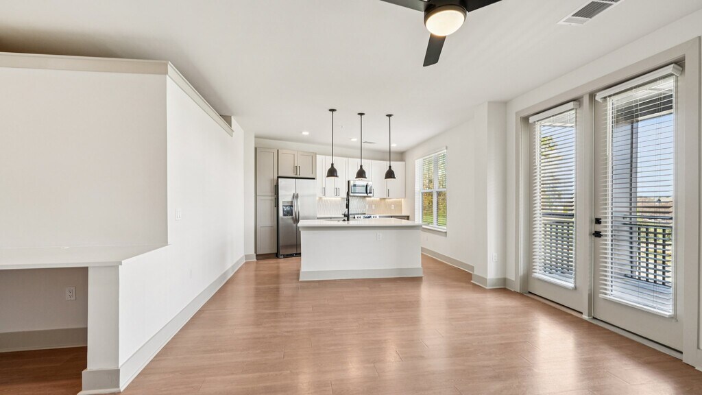 Merritt Apartments offers studio, one, two, and three-bedroom layouts that blend generous space with timeless design. Inside, you’ll find quartz countertops, nine-foot ceilings, and open-concept floor plans that feel bright and inviting. Thoughtful touches like modular closets, oversized doors, and built-in niches add style and function, while select homes include private fenced yards, mudroom entries, or walk-in shower benches. With smart thermostats and secure fob-access entry, your home is designed for both comfort and convenience.