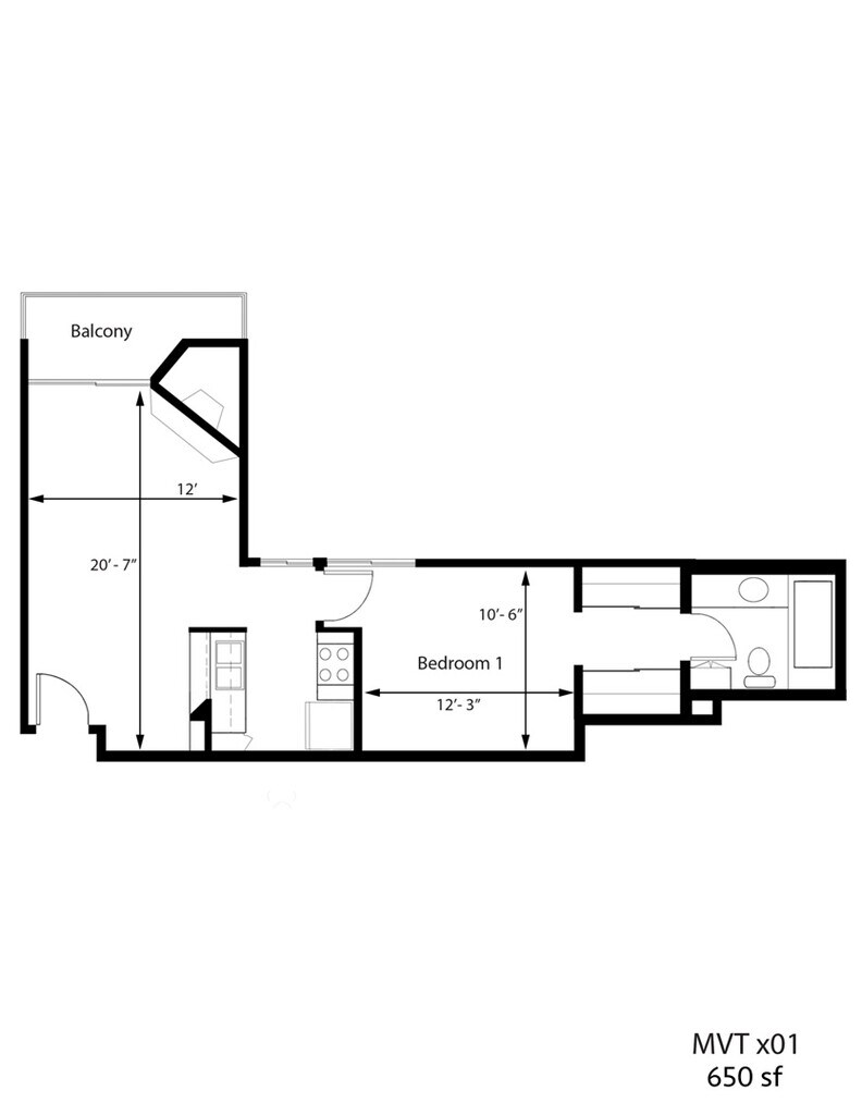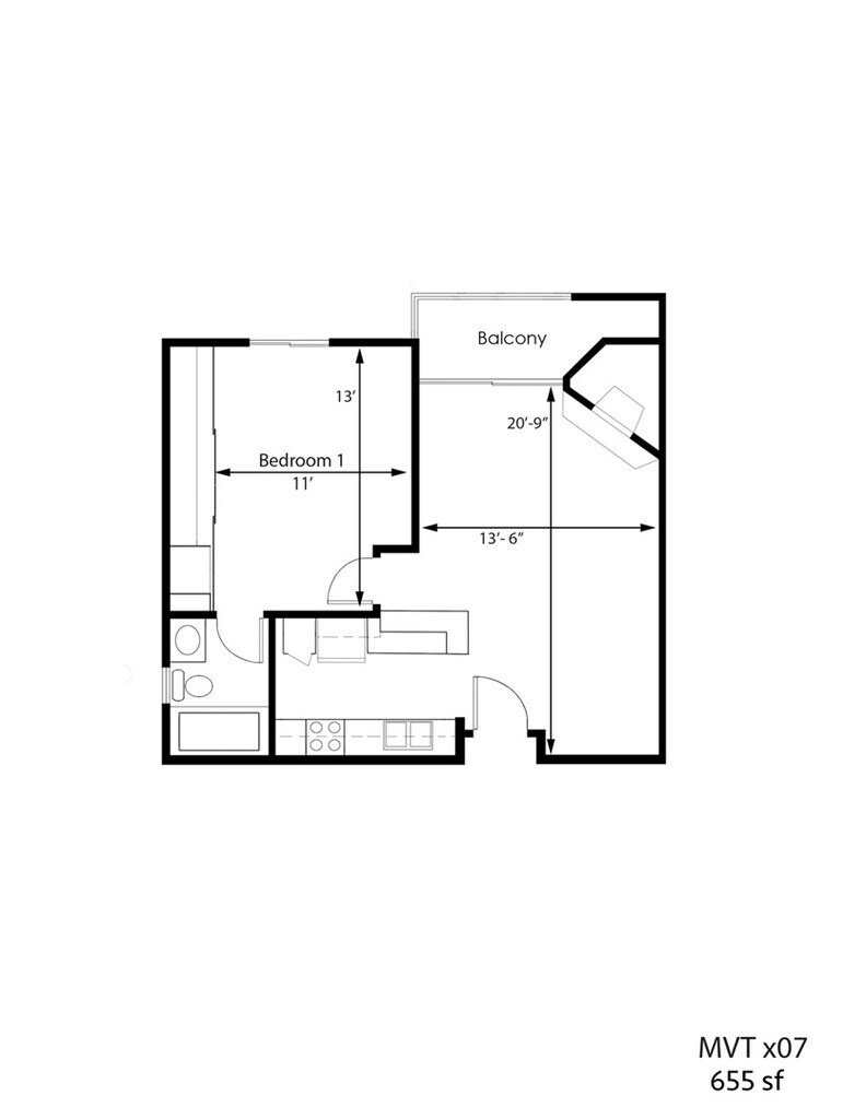 1 Dormitorio, 1 Baño, 655 pies²Galería del Modelo