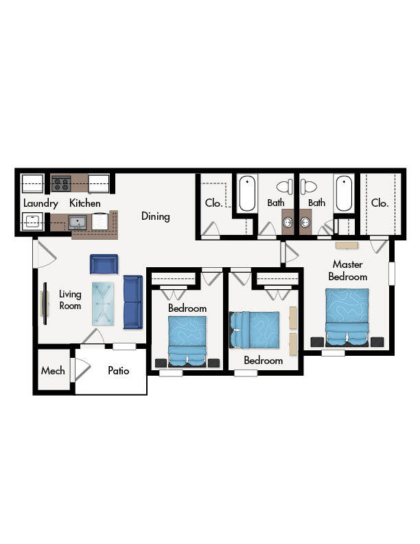 2BR,2BTH - Plano 1 3 Dormitorios