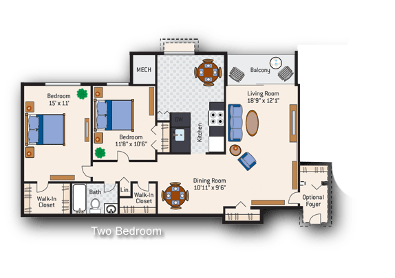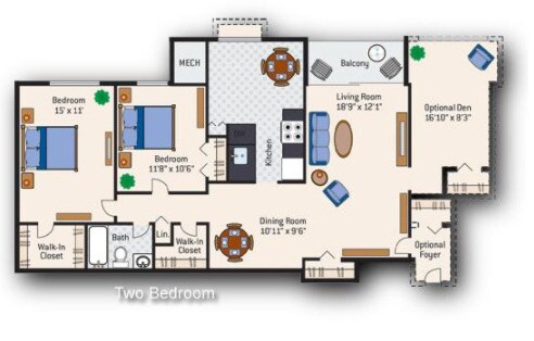 Modelo de apartamento: 2 Bedroom 1 Bath + DenLlame para Precios2 Dormitorios, 1 Baño, 1050 sq ftNo Disponible![]()