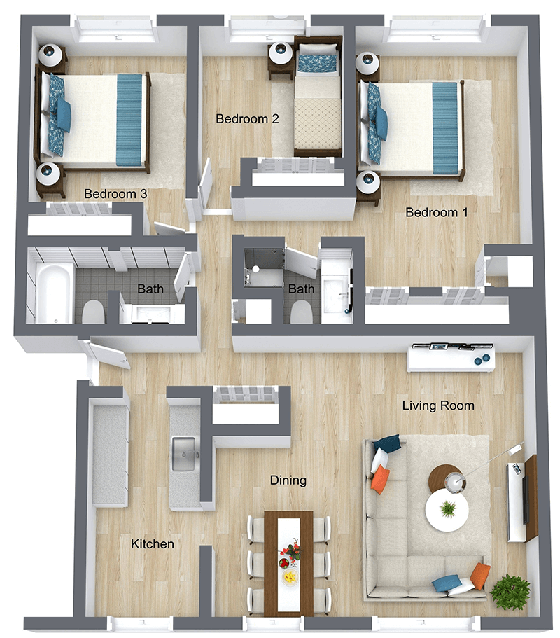 Modelo de apartamento: GeneseeLlame para Precios3 Dormitorios, 2 Baños, 1330 sq ftNo Disponible![]()