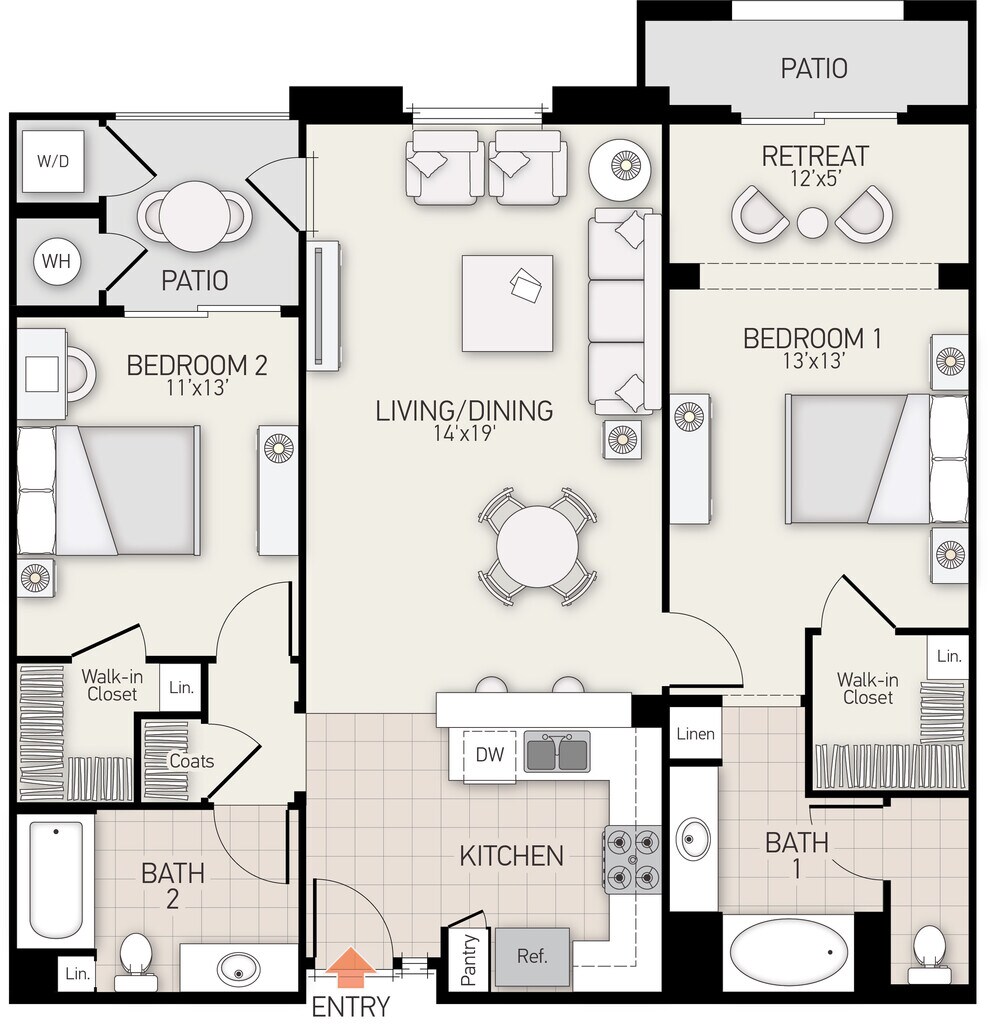 Modelo de apartamento: Plan EDesde $3,5952 Dormitorios, 2 Baños, 1211 sq ftDisponible Ahora![]()