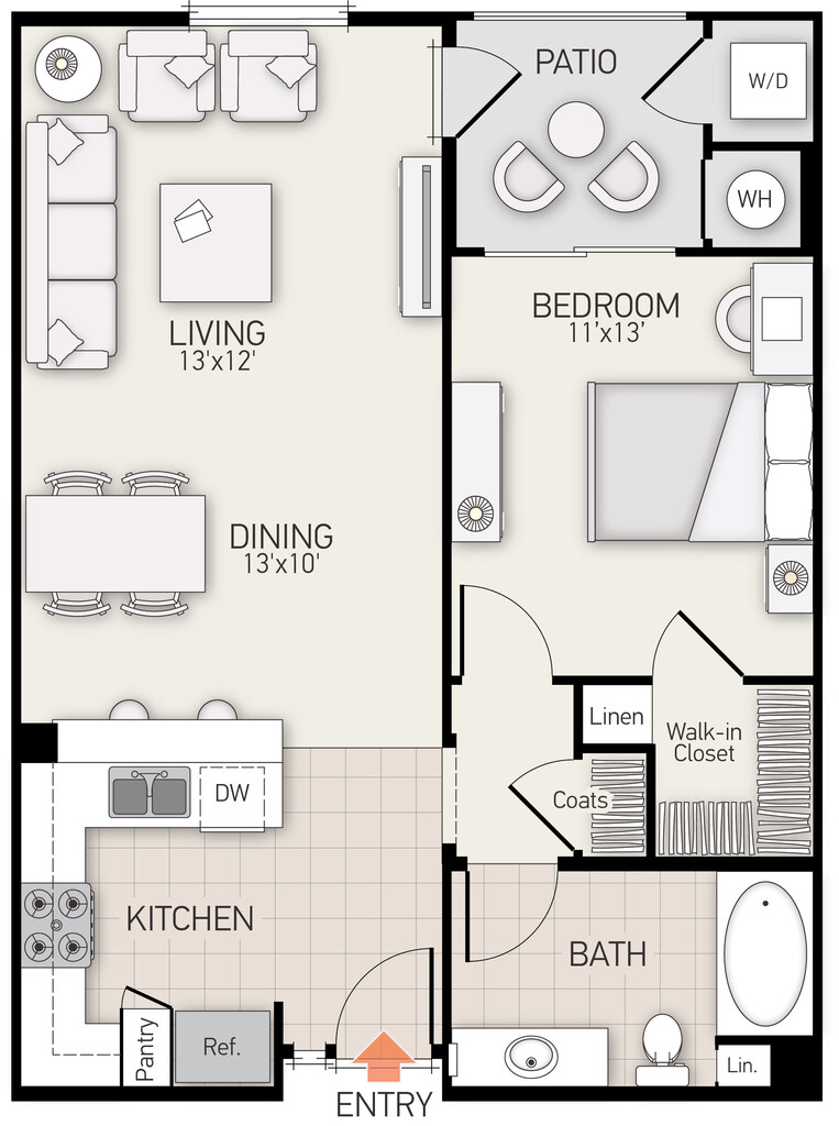Modelo de apartamento: Plan BDesde $2,6101 Dormitorio, 1 Baño, 763 sq ftDisponible Ahora![]()