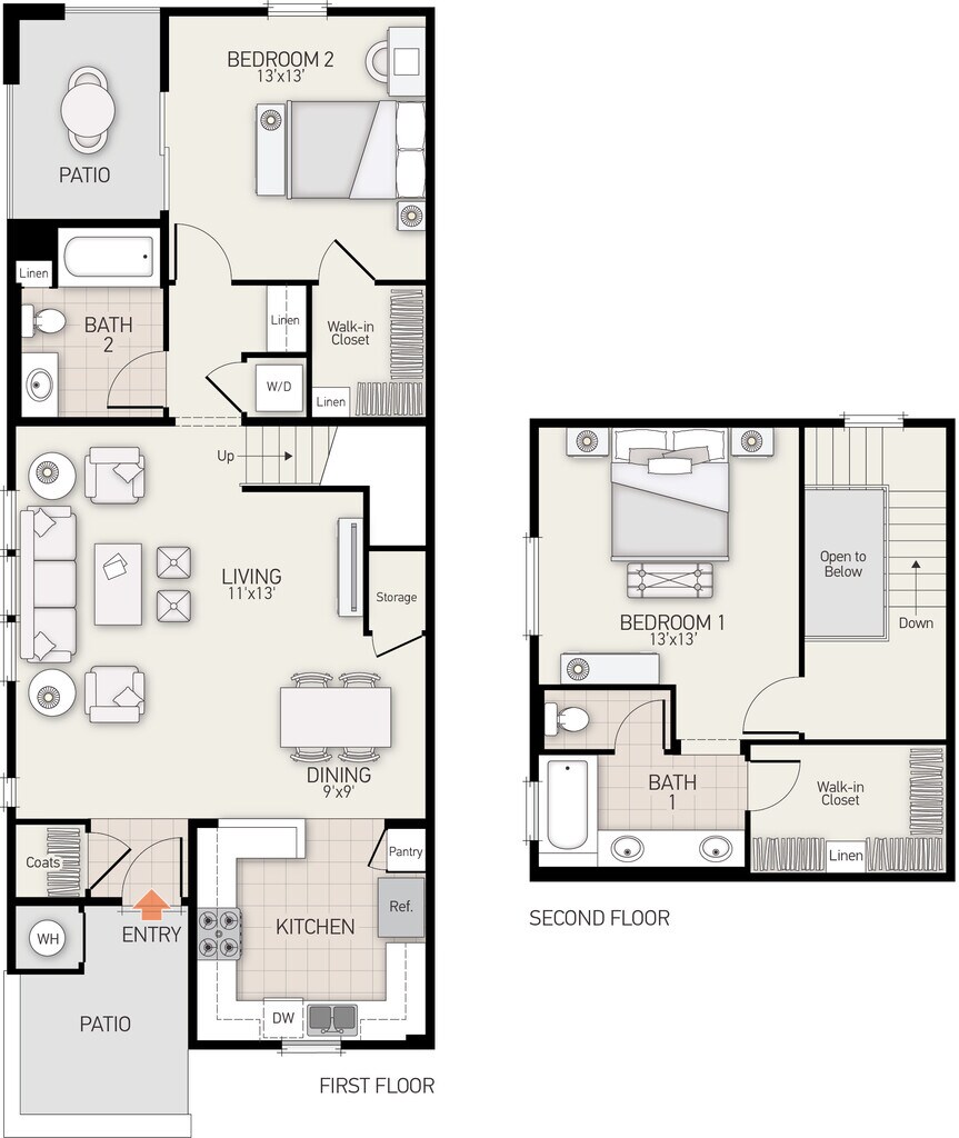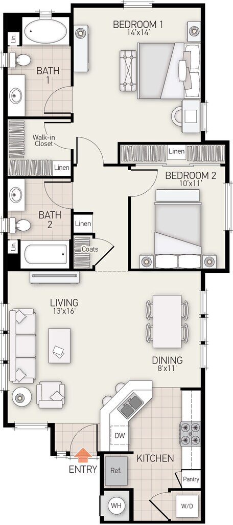 Plan E - Plano 1 Unidad de apartamento: 14302Modelo de apartamento: Plan EDesde $3,5952 Dormitorios, 2 Baños, 1211 sq ftDisponible AhoraPlan D