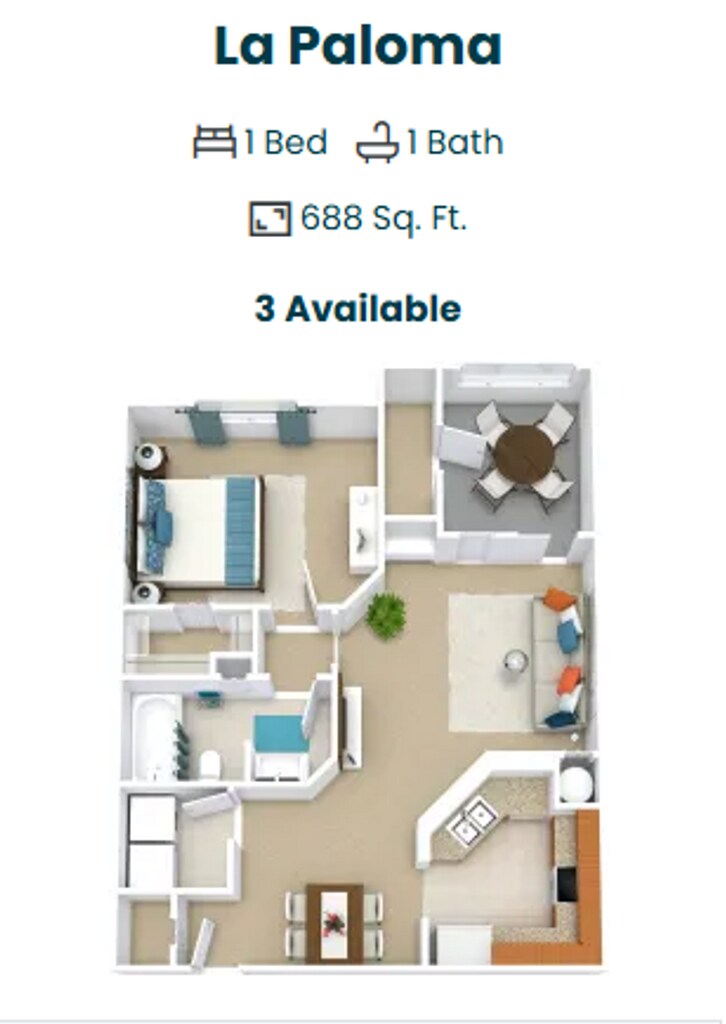 Unidad de apartamento: 06-202Modelo de apartamento: La Paloma A2WJDesde $1,4711 Dormitorio, 1 Baño, 688 sq ftDisponible Ahora![]()