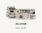Claver - Plano 1 Unidad de apartamento: 103Modelo de apartamento: Claver$1,409Estudio, 1 Baño, 664 sq ftDisponible February 1, 20261 Dormitorio