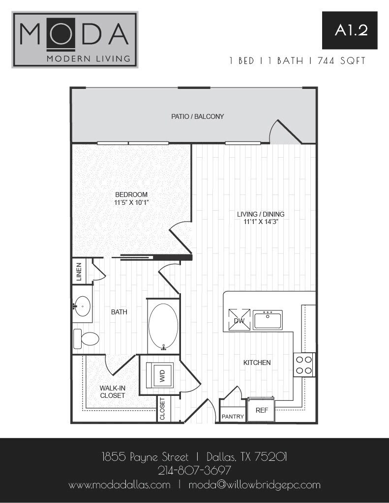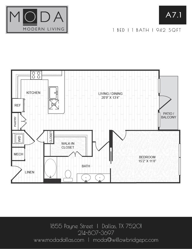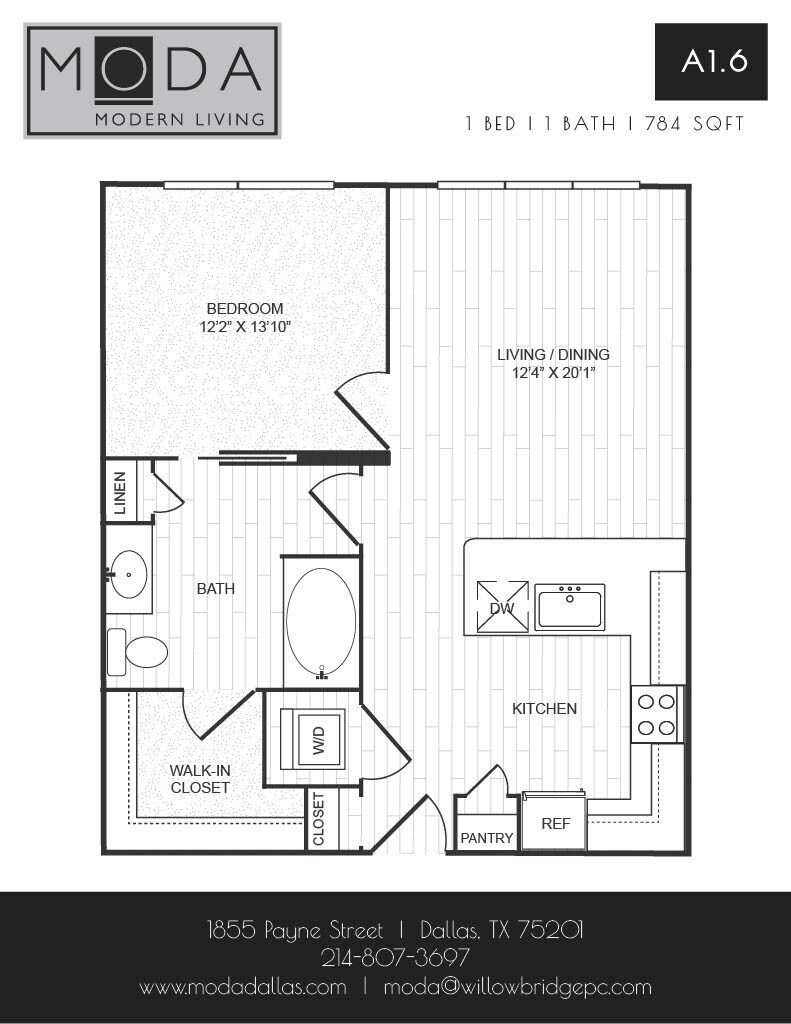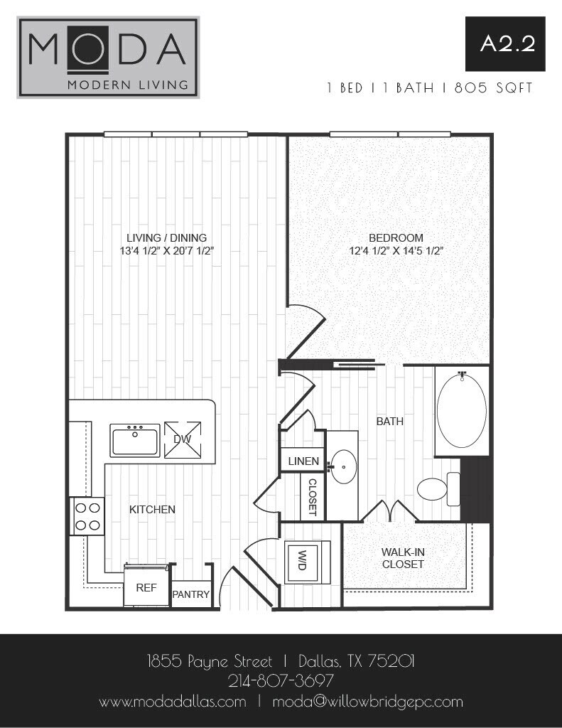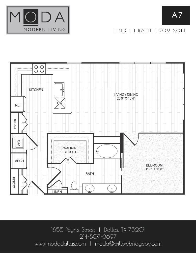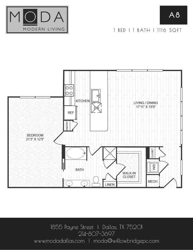 Moda Apartments se encuentra en el Barrio Victory Park y el código postal 75201 de Dallas, TX. Esta comunidad está gestionada profesionalmente por Willow Bridge Property Company