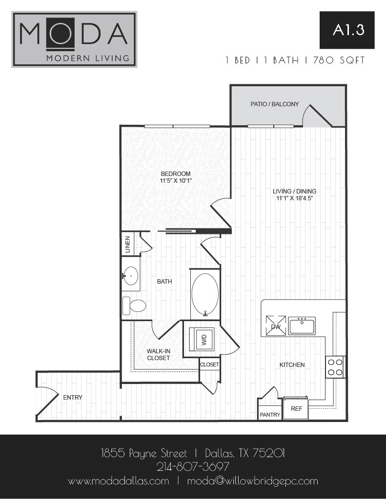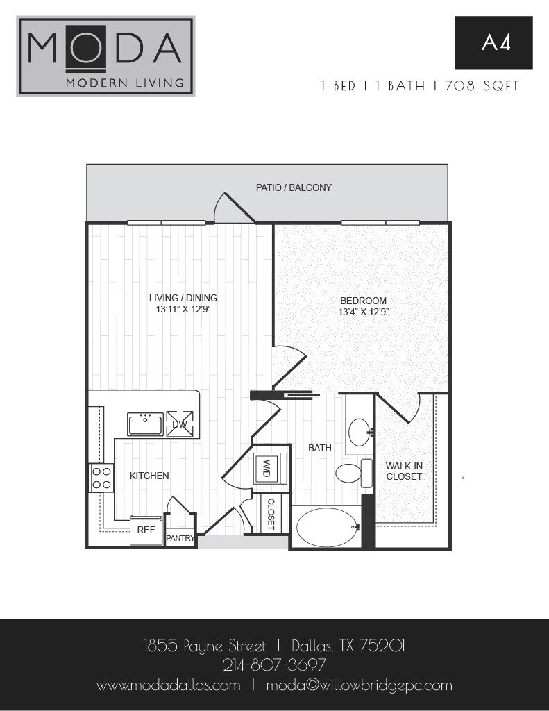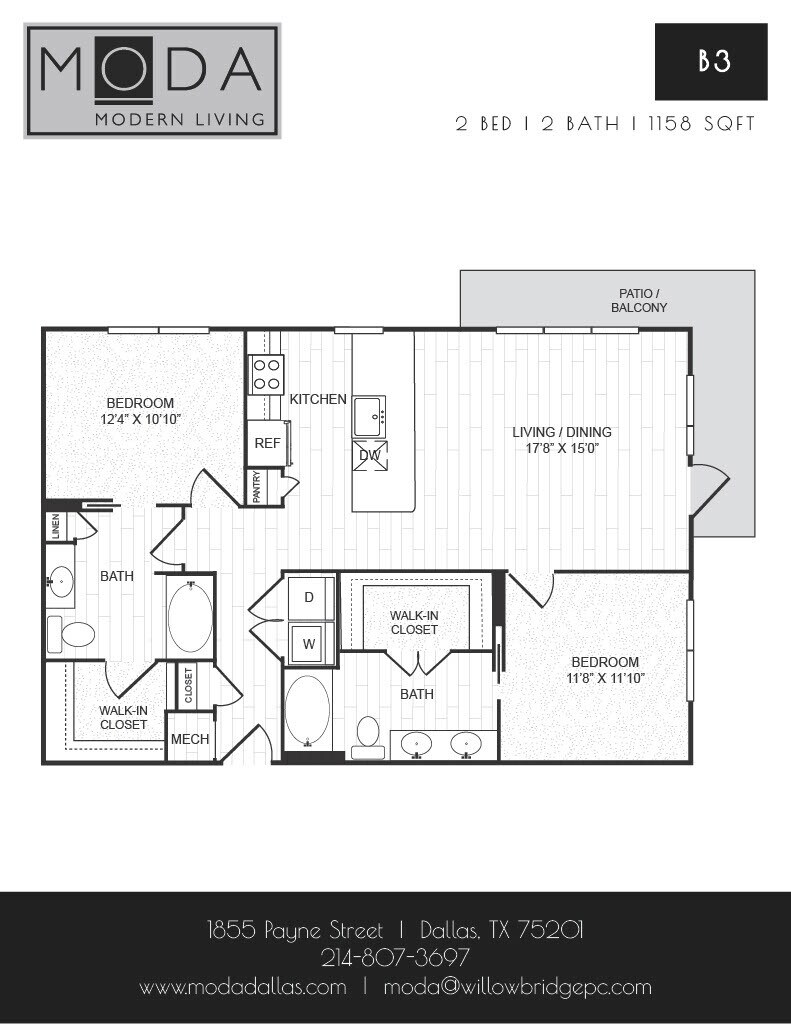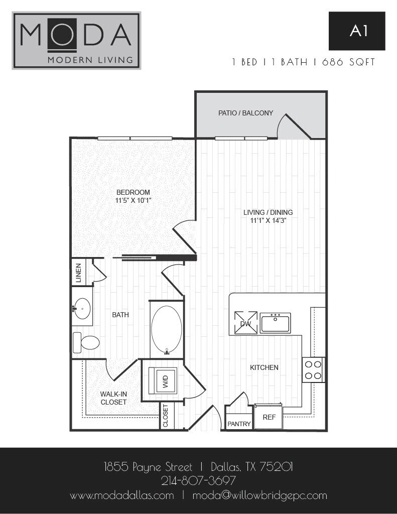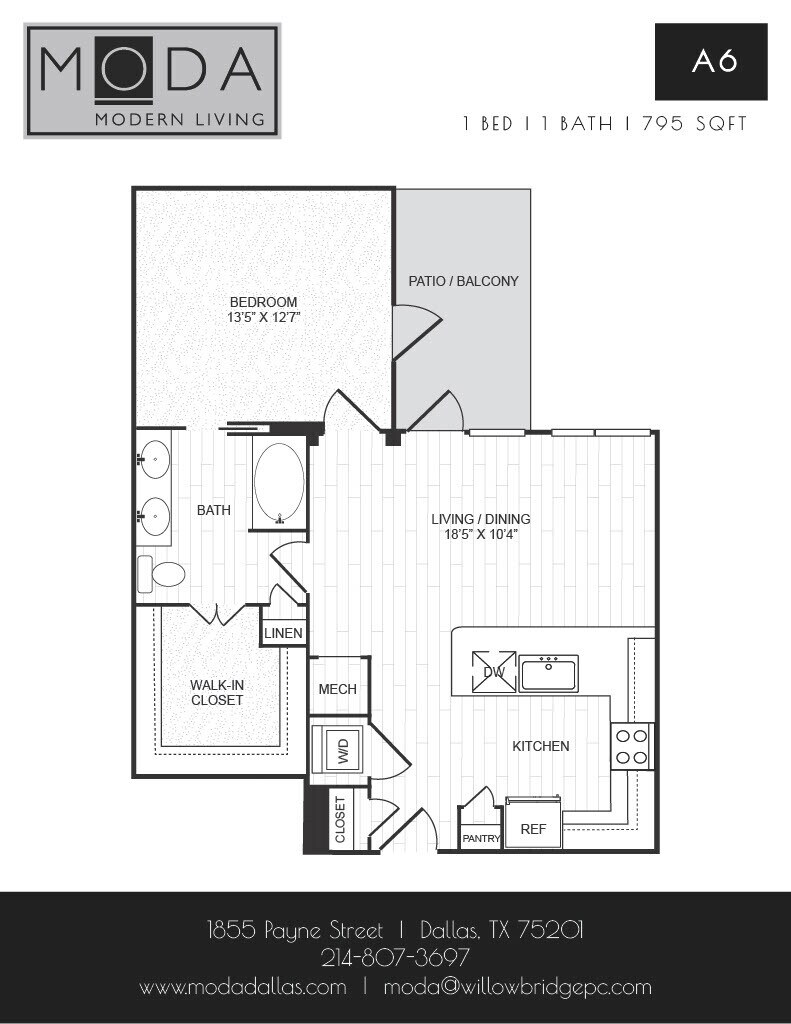 Moda Apartments se encuentra en el Barrio Victory Park y el código postal 75201 de Dallas, TX. Esta comunidad está gestionada profesionalmente por Willow Bridge Property Company