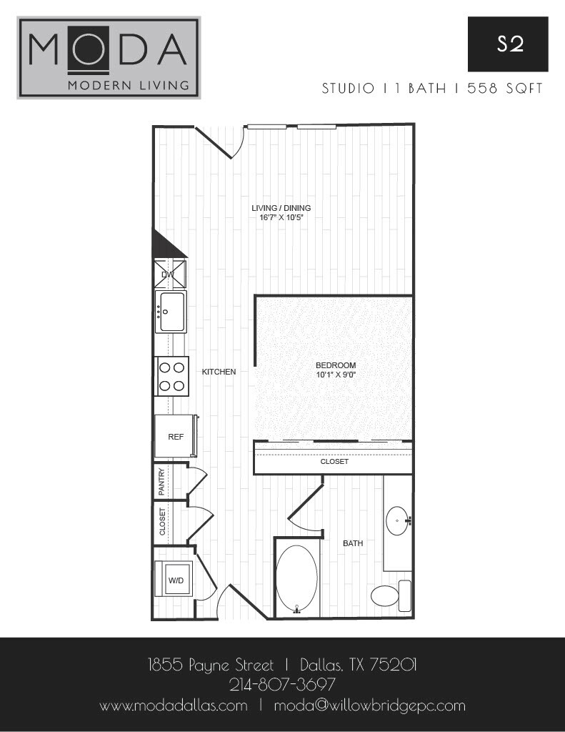 S2 - Plano 2 Unidad de apartamento: 327Modelo de apartamento: S2$1,561Estudio, 1 Baño, 558 sq ftDisponible Ahora1 Dormitorio