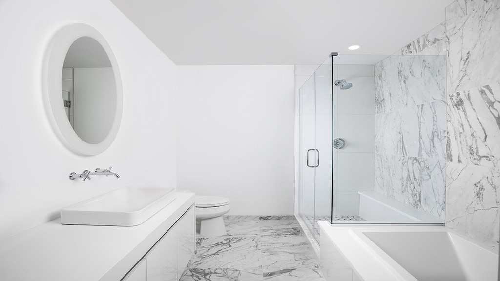 - Baños inspirados en spa con espejos iluminados, pisos de mosaico, duchas, bañeras y pisos seleccionados.