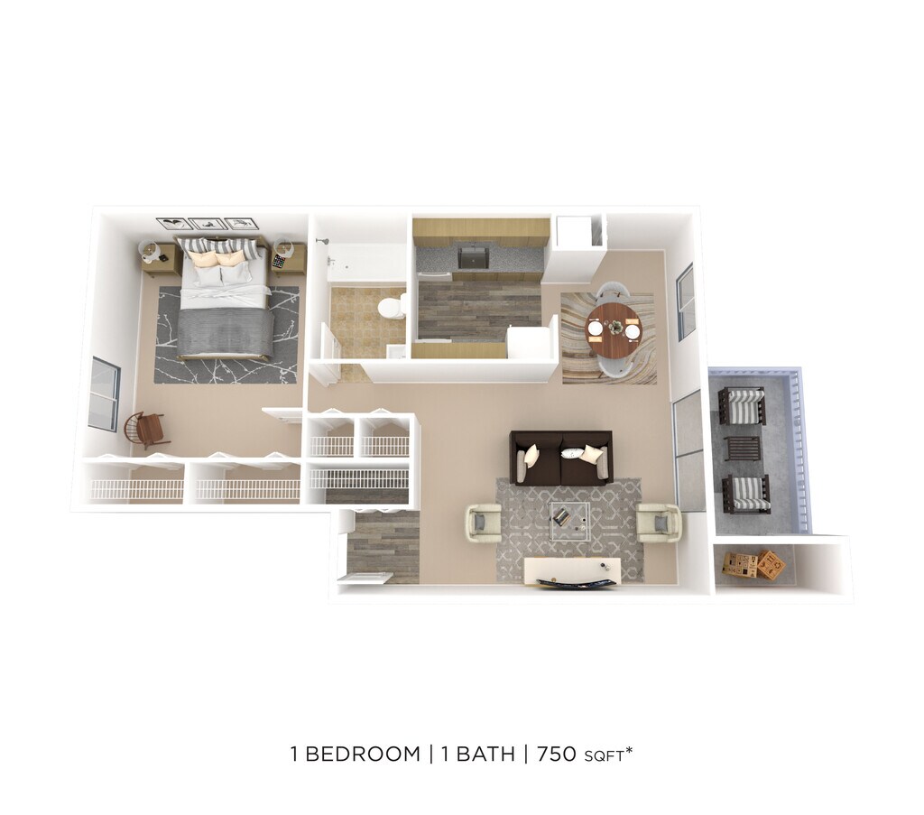 1 Dormitorio, 1 Baño, 750 pies²Disponible AhoraGalería del Modelo