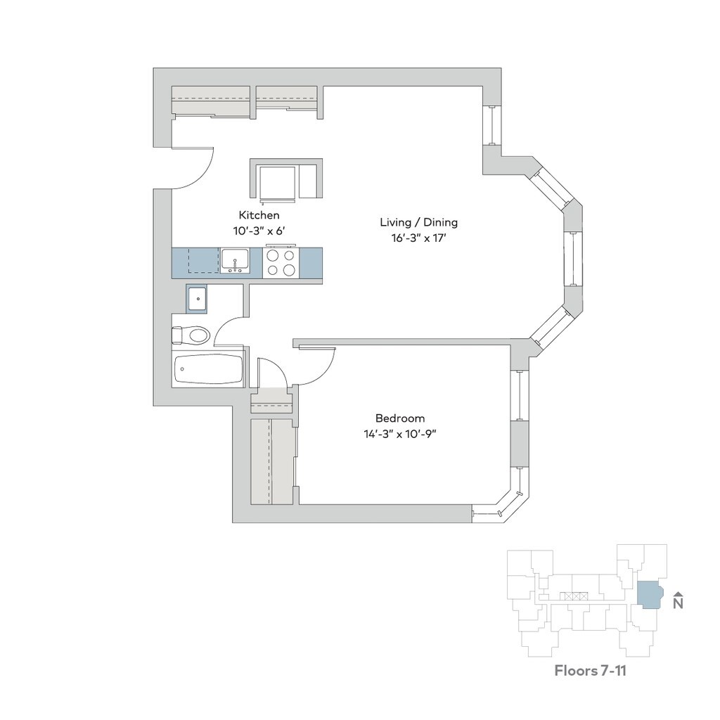 Modelo de apartamento: mon-1bs1 Dormitorio, 1 Baño, 598 sq ftDisponible Ahora![]()