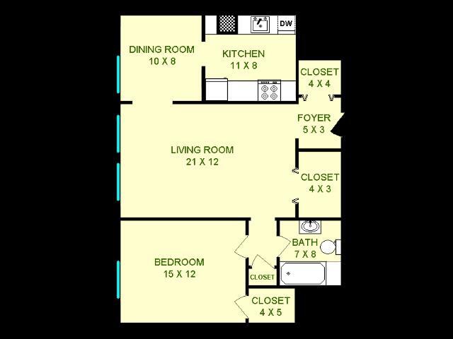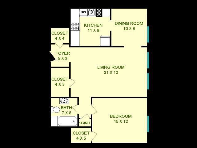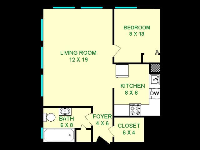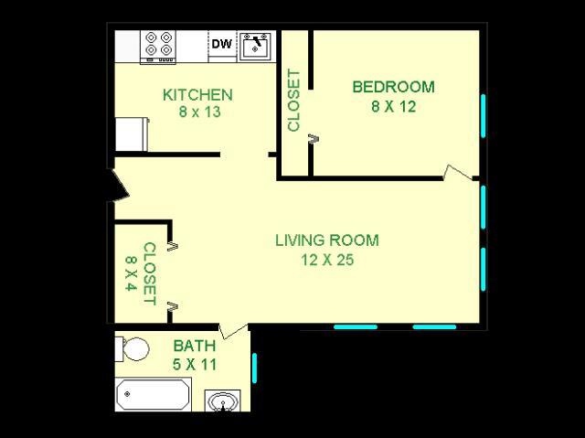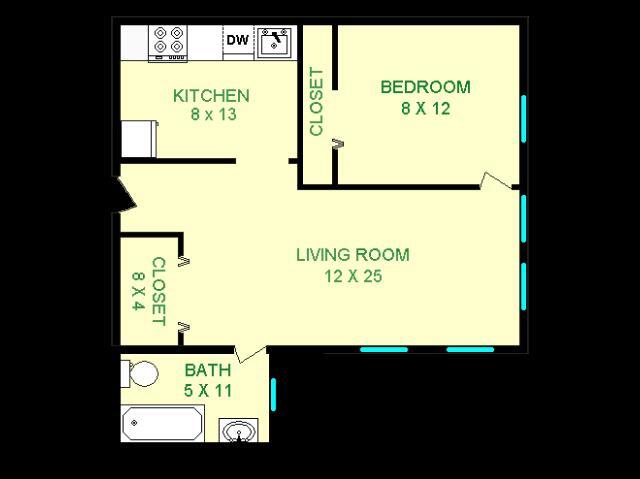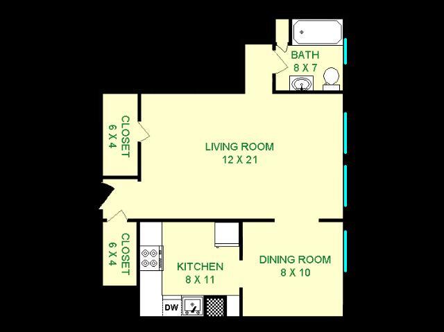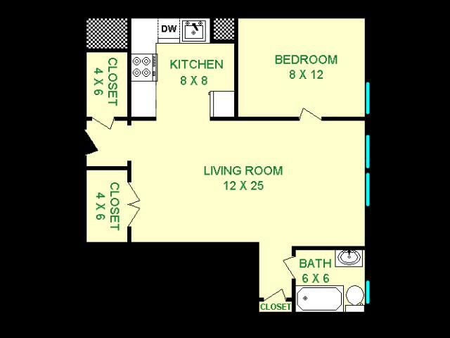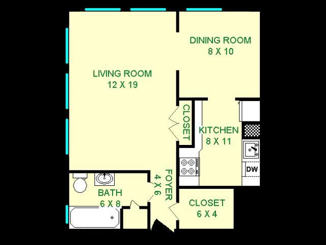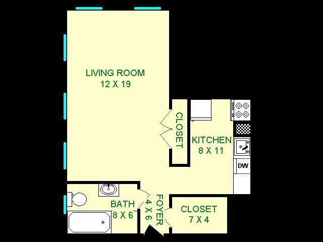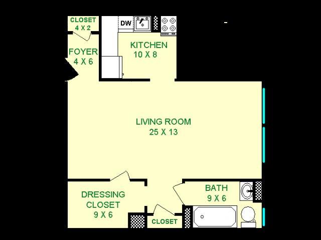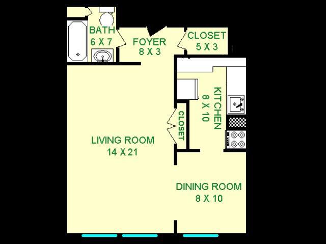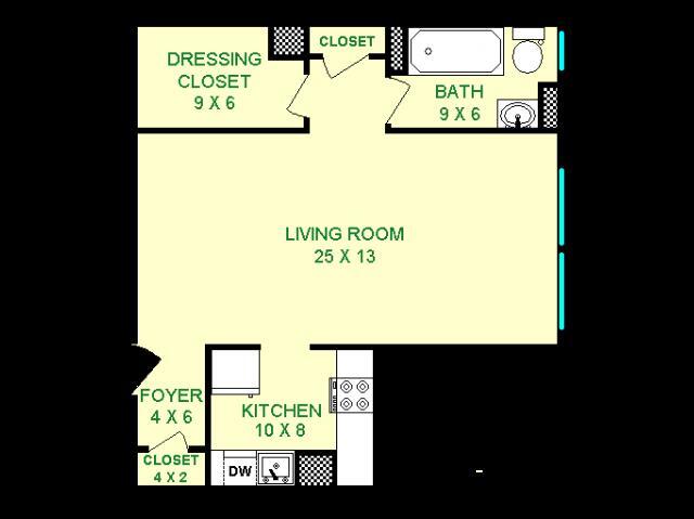 Modelo de apartamento: Eldorado$1,275Estudio, 1 Baño, 660 sq ftDisponible AhoraLos planos son representaciones artísticas. Todas las dimensiones son aproximadas. El producto y las especificaciones reales pueden variar en tamaño o detalle. No todas las características están disponibles en cada vivienda en alquiler. Por favor, consulta con un representante para obtener más detalles.