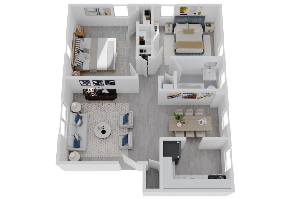 Modelo de apartamento: Two BedroomDesde $1,6192 Dormitorios, 1 Baño, 730 sq ftDisponible AhoraPlanosFotos![]()