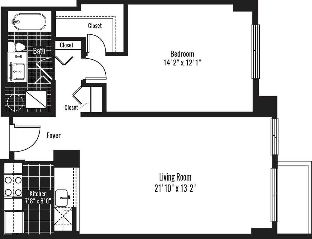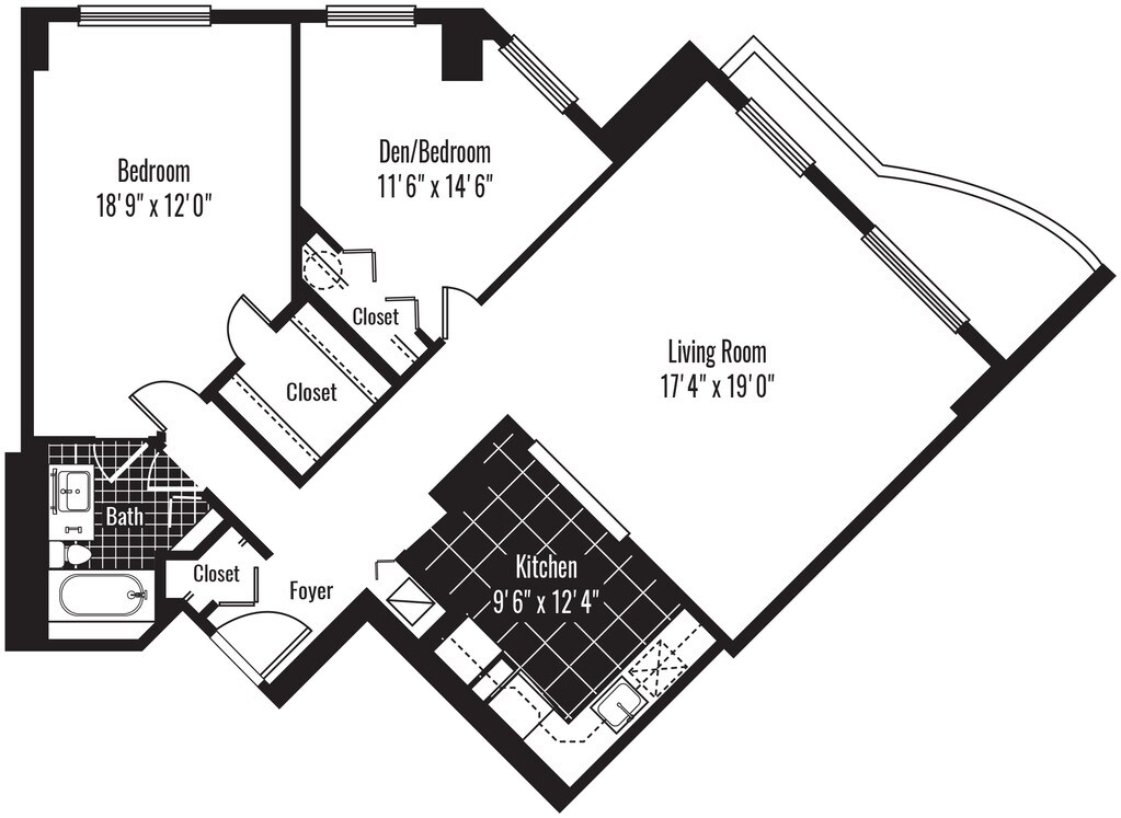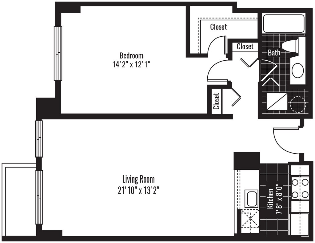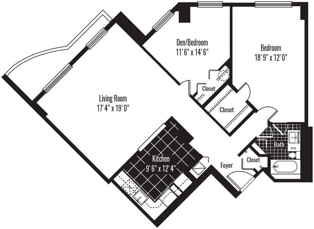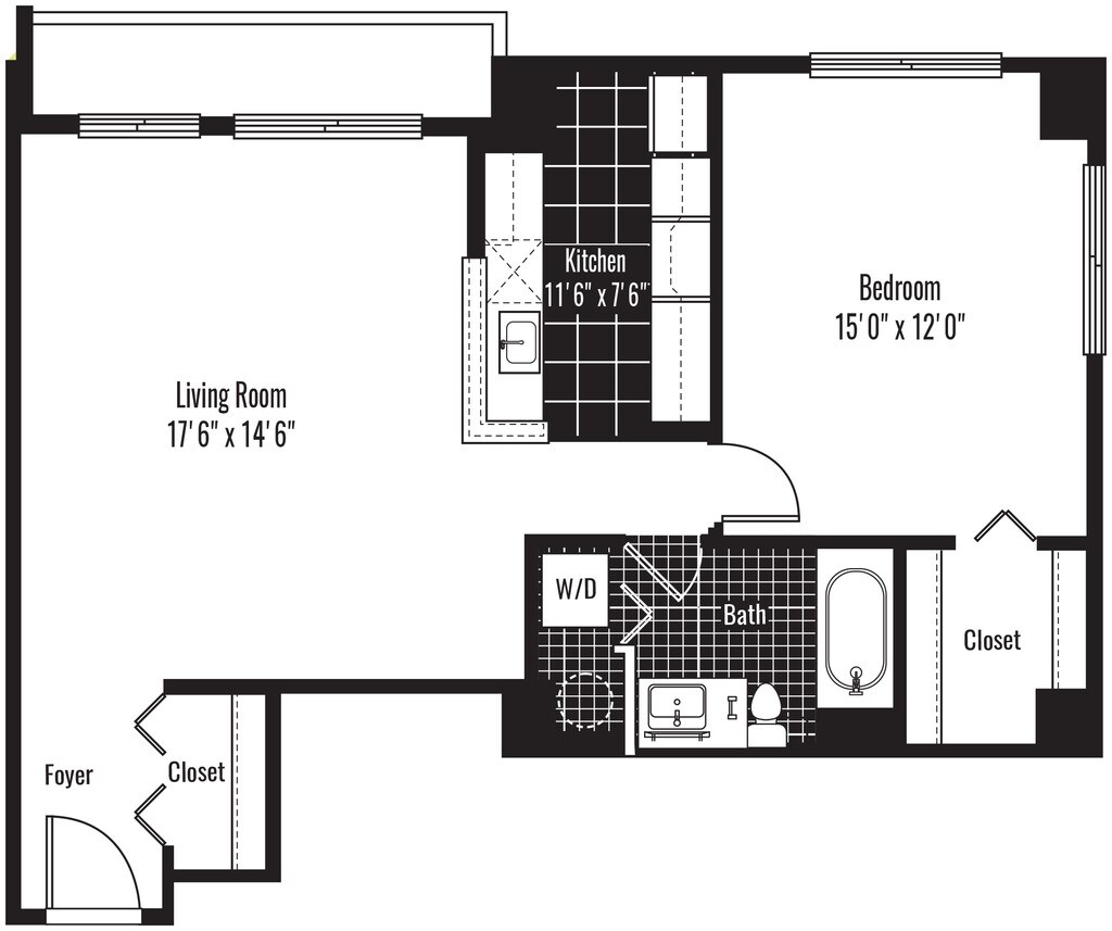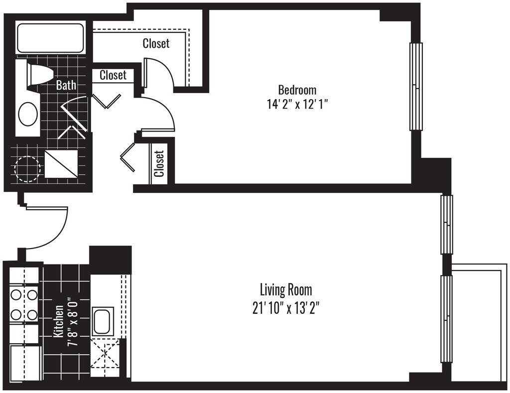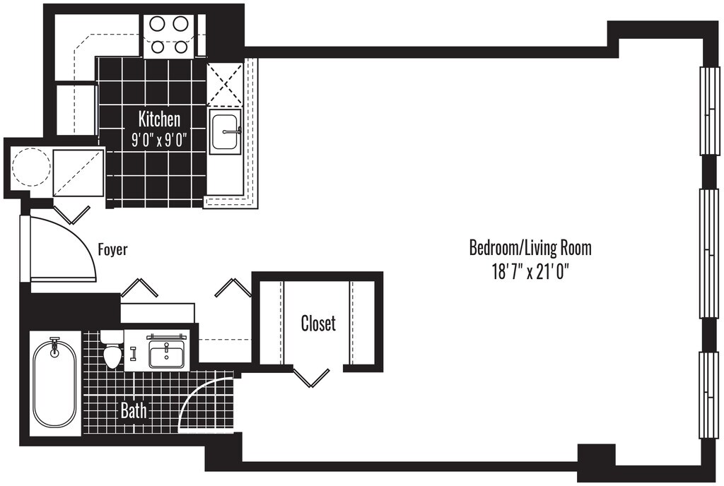 Modelo de apartamento: 1S1 Dormitorio, 1 Baño, 688 sq ftNo Disponible![]()