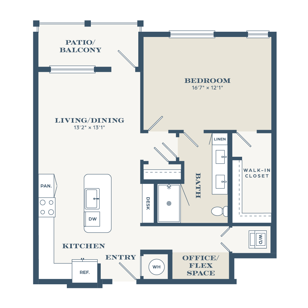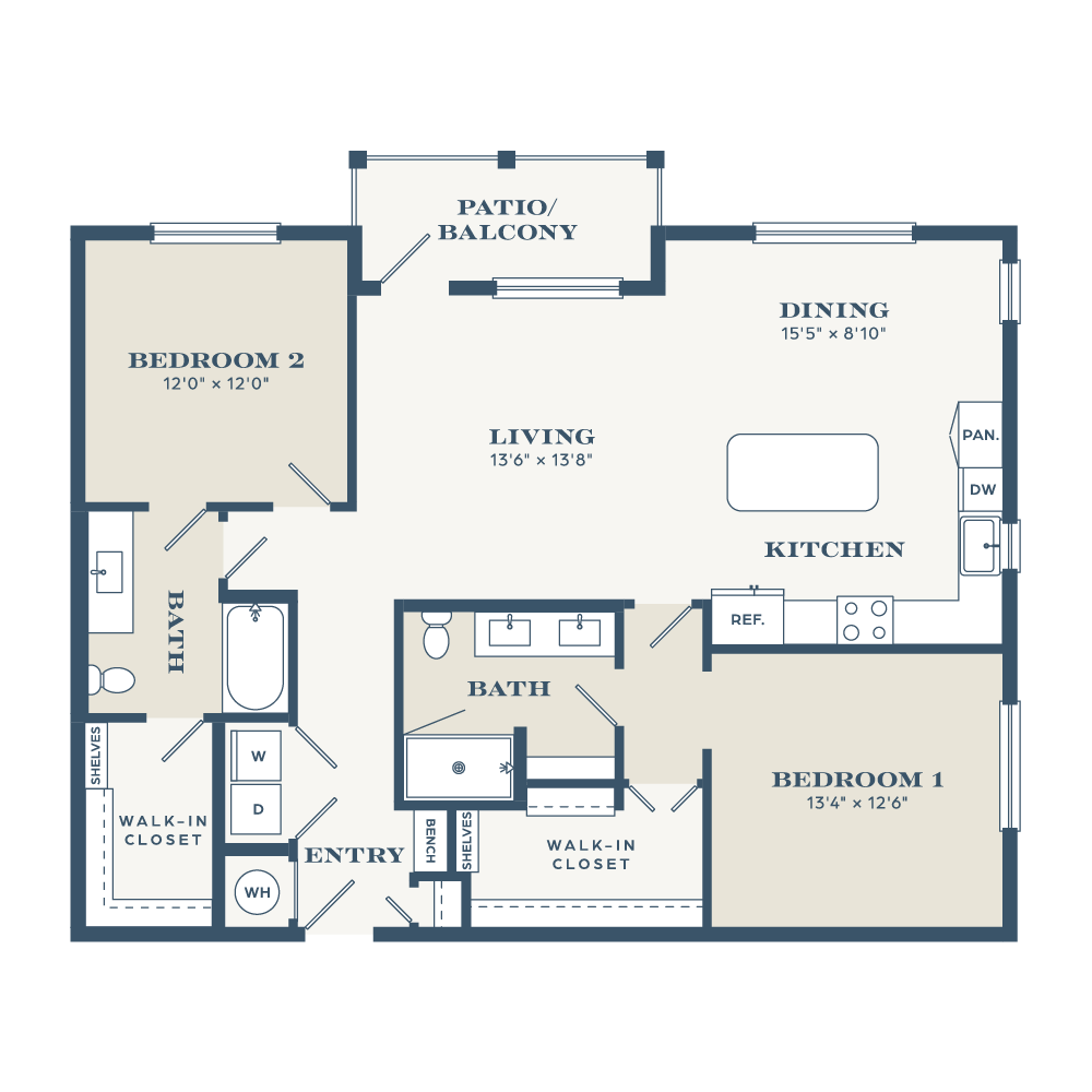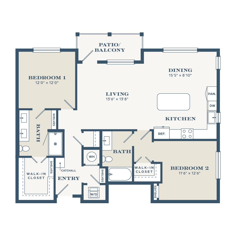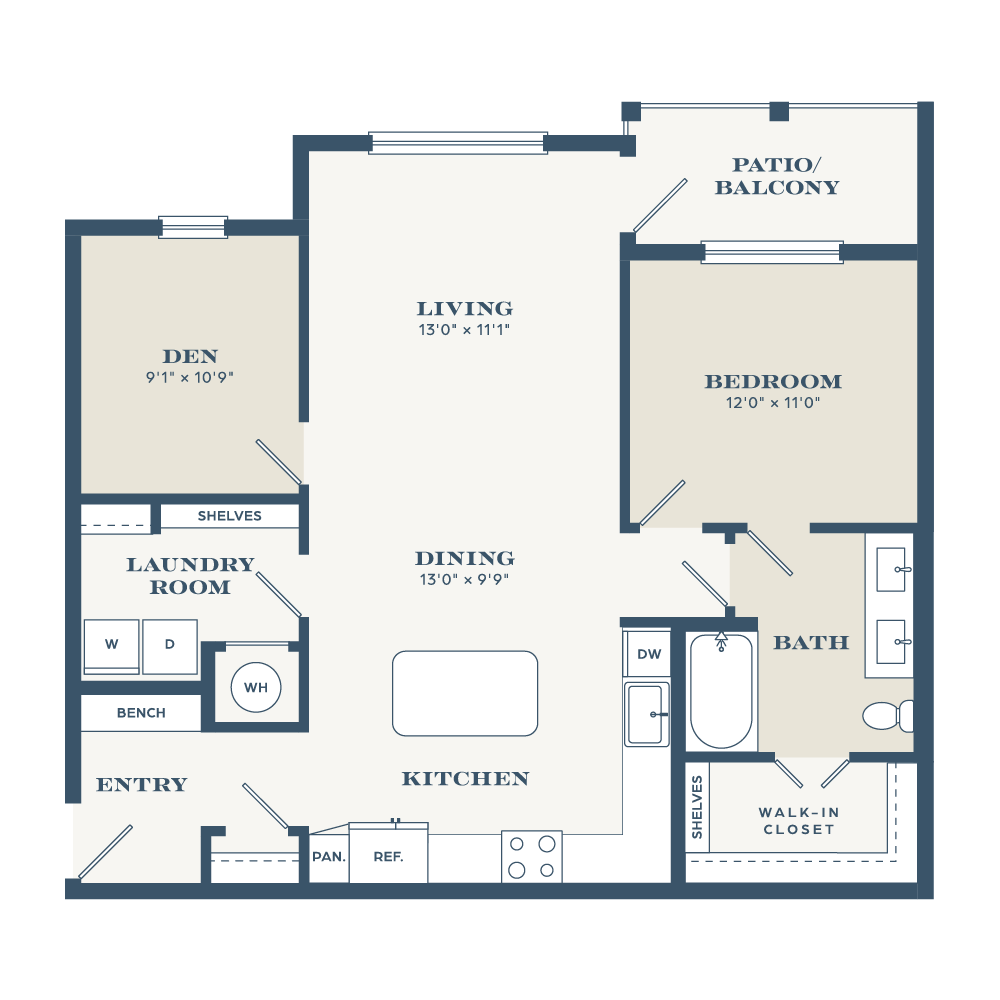 Modelo de apartamento: A1Desde $1,5491 Dormitorio, 1 Baño, 691 sq ftDisponible Ahora![]()