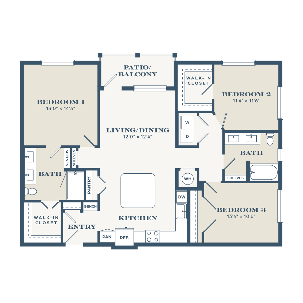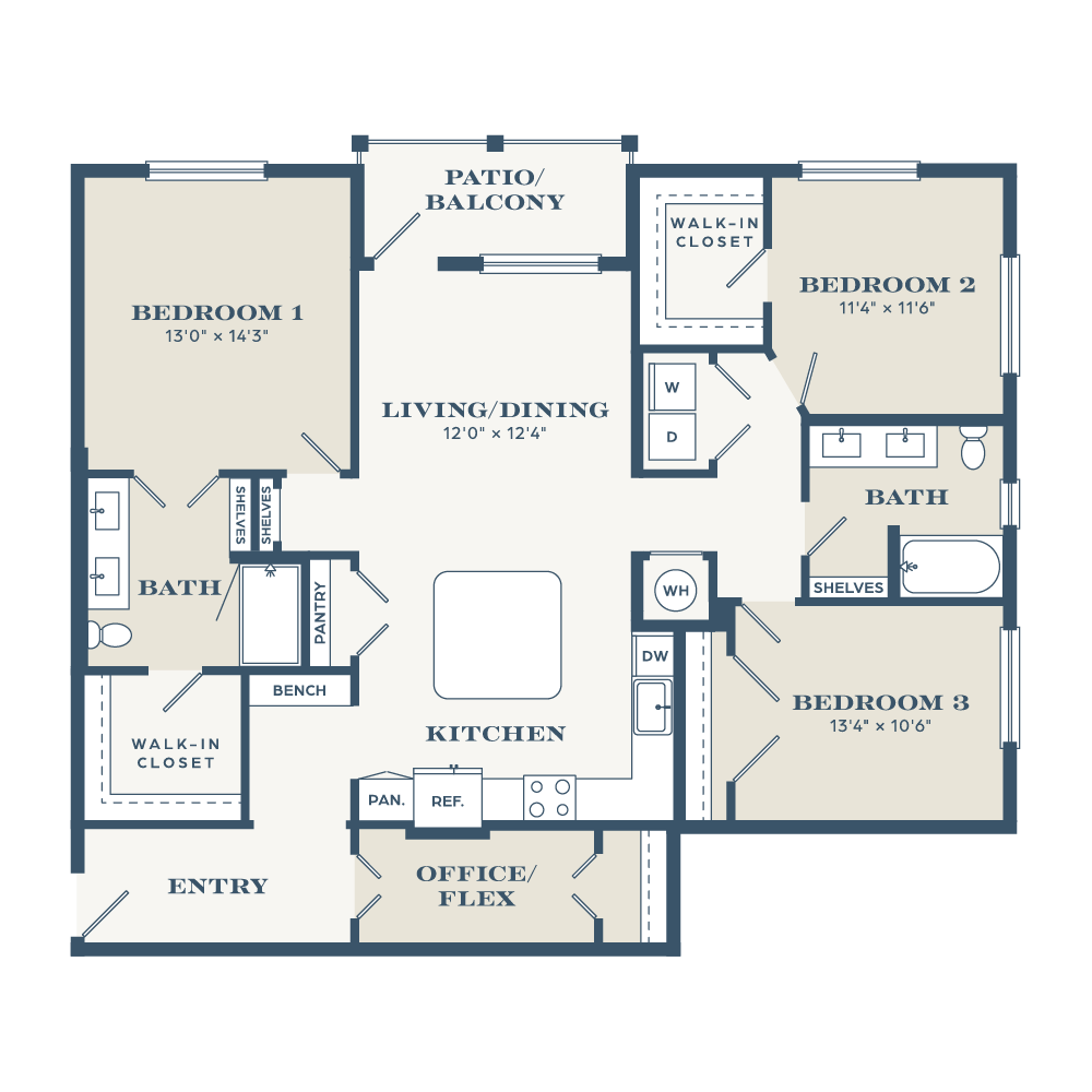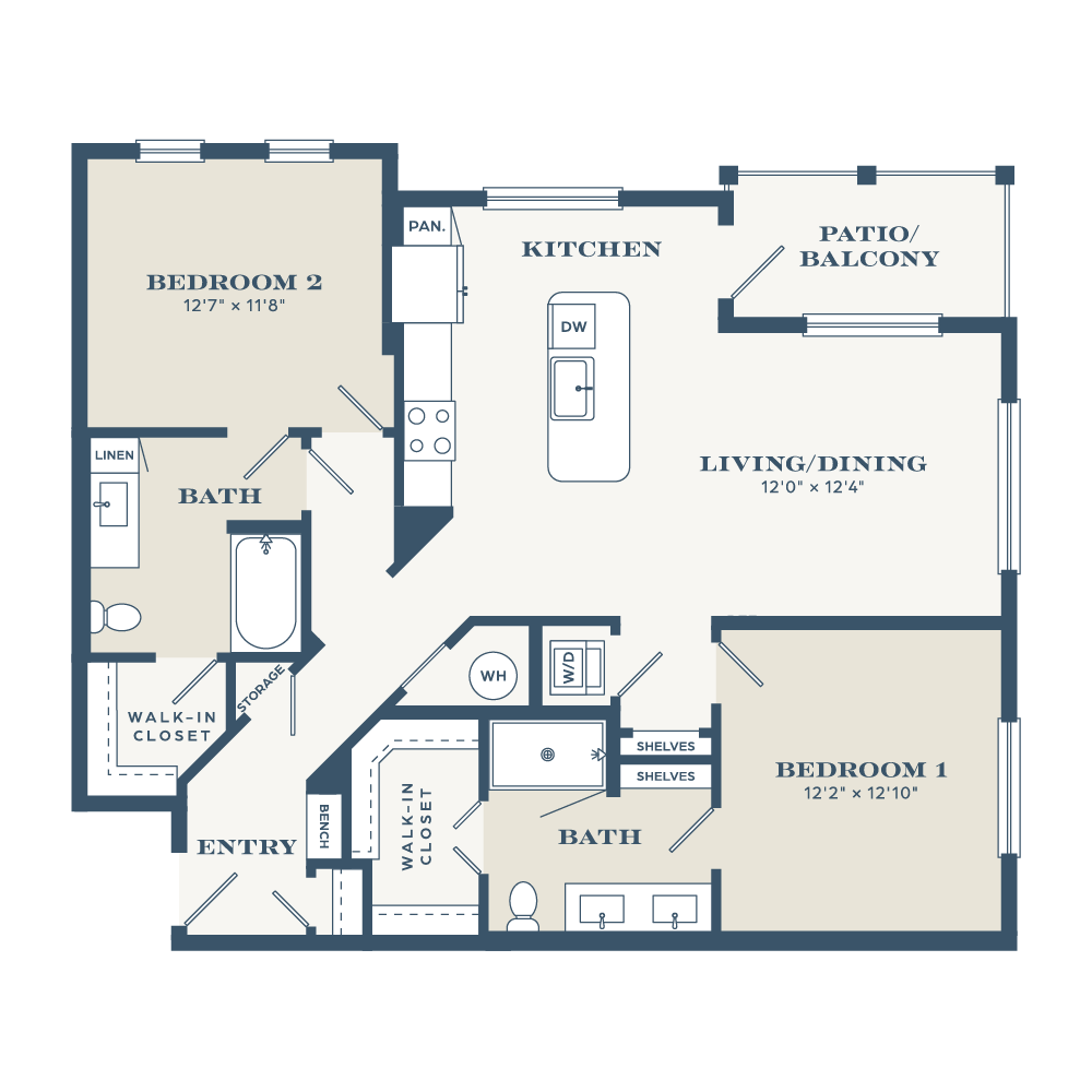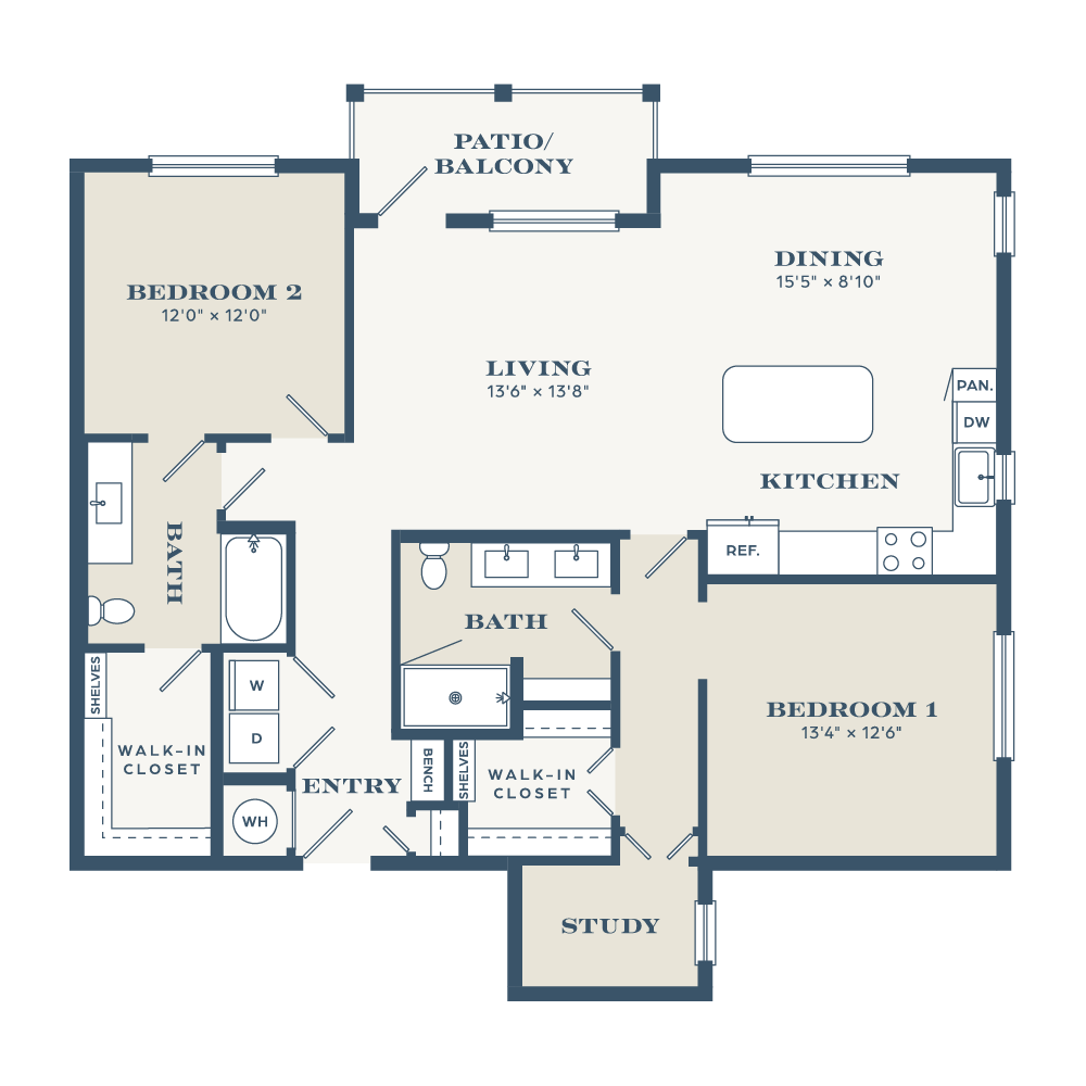 Modelo de apartamento: A1Desde $1,5491 Dormitorio, 1 Baño, 691 sq ftDisponible Ahora![]()