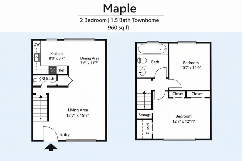 Modelo de apartamento: MapleDesde $1,1952 Dormitorios, 1.5 Baños, 960 sq ftDisponible AhoraLos planos son representaciones artísticas. Todas las dimensiones son aproximadas. El producto y las especificaciones reales pueden variar en tamaño o detalle. No todas las características están disponibles en cada vivienda en alquiler. Por favor, consulta con un representante para obtener más detalles.