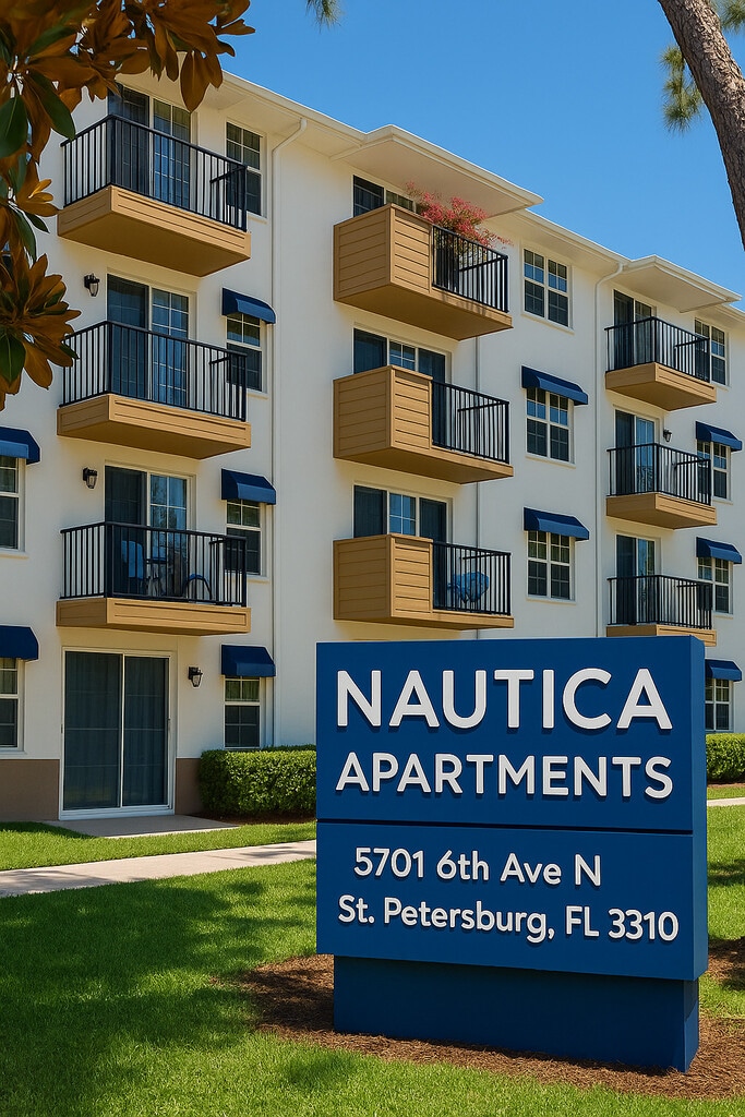 Nautica Apartments es un complejo de apartamentos de tamaño medio con una conveniente ubicación céntrica en St Pete. Nos enorgullecemos de nuestro sentido de comunidad y de nuestro amistoso personal. A diferencia de la mayoría de los edificios de apartamentos, nuestros edificios son de hormigón (no con marco de madera) y, por consiguiente, mucho más tranquilo, inmune a termitas, y mucho más resistentes contra huracanes. ¡Acércate o llámanos hoy y encuentra tu nuevo hogar!