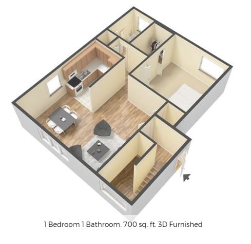 1 Dormitorio, 1 Baño, 700 pies²Disponible AhoraGalería del Modelo