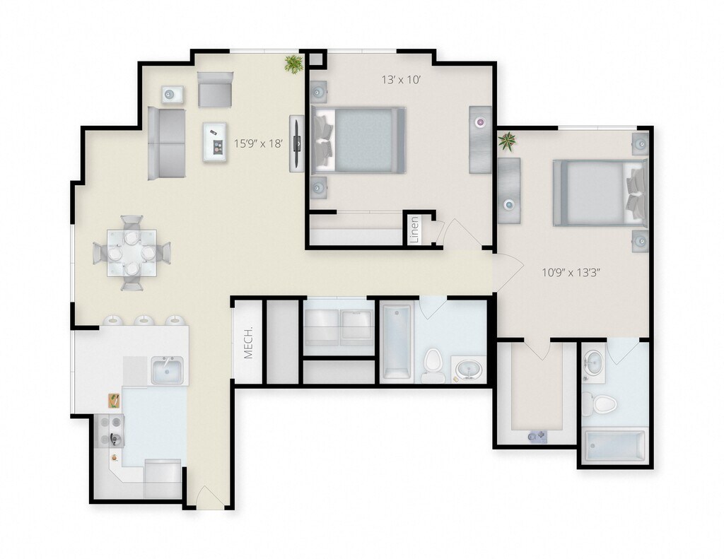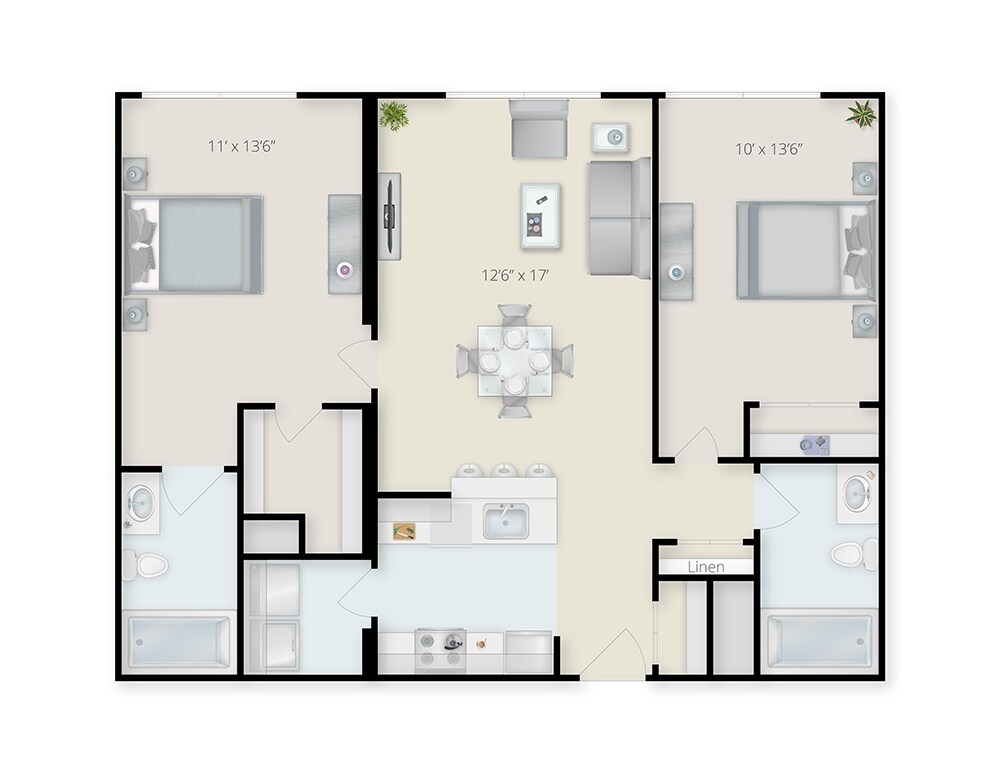 Two Bedroom Two Bath - Plano 1 Unidad de apartamento: TC-401Modelo de apartamento: Two Bedroom Two Bath$2,6302 Dormitorios, 2 Baños, 1155 sq ftDisponible Ahora![]()
