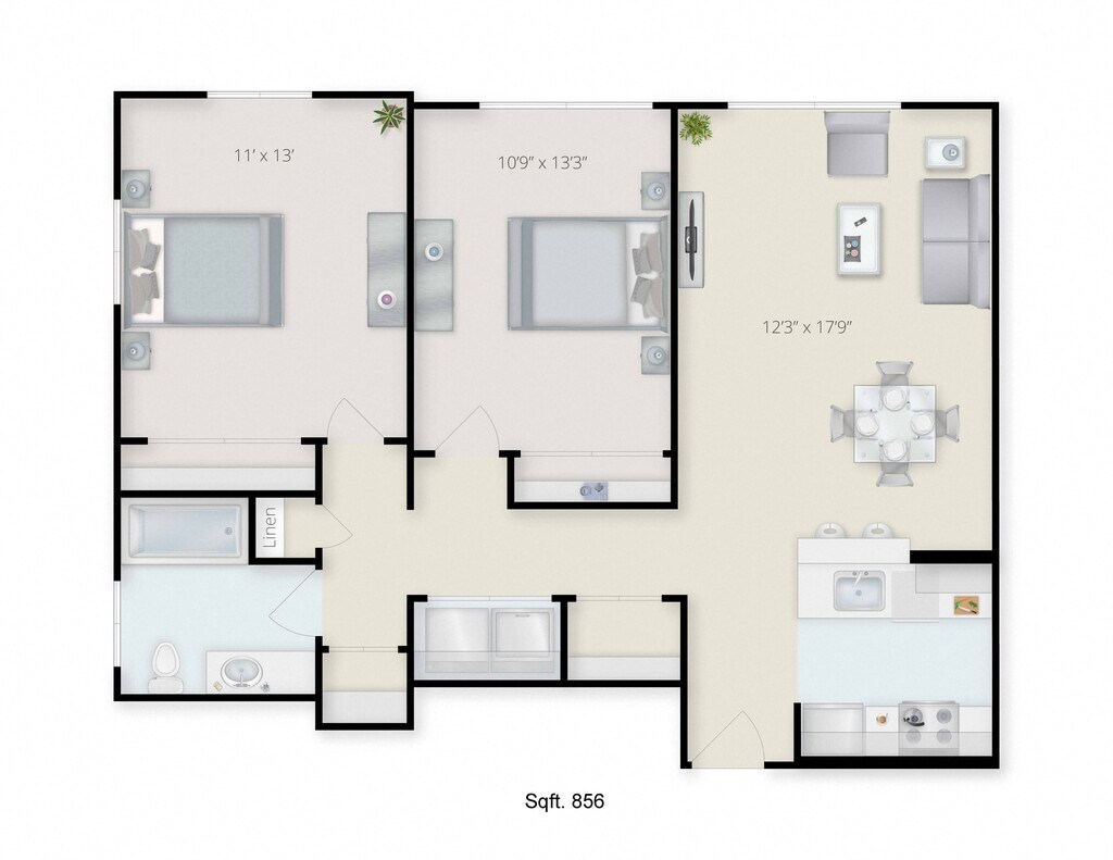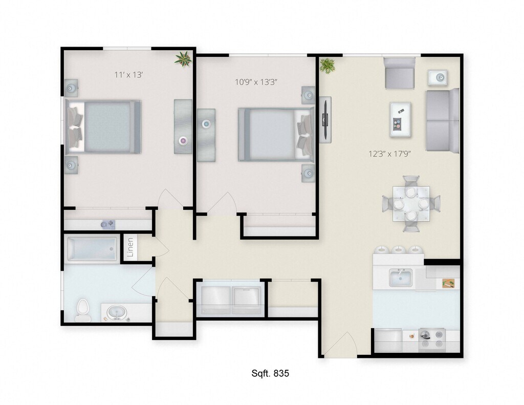 Two Bedroom One Bath - Plano 1 Unidad de apartamento: SH-909Modelo de apartamento: Two Bedroom One Bath$2,5302 Dormitorios, 1 Baño, 835 sq ftDisponible Ahora![]()