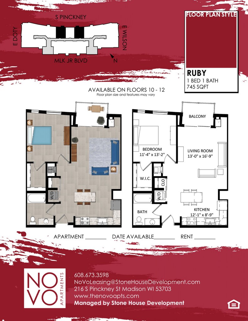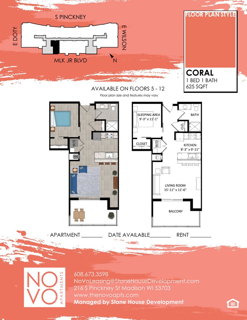 DILE SÍ A NOVO La apariencia impactante de NoVo es una nueva y excelente incorporación a la ya impresionantes ciudad de Madison. Ubicado a pasos del Capitolio del estado de Wisconsin, NoVo aporta una nueva vida y una fresca perspectiva para tu ubicación en el centro de la ciudad. Disfruta de un emocionante estilo de vida urbano rodeado de mercados, restaurantes gourmet, animados pubs, cafeterías, supermercados y entretenimiento de primera categoría. Dile SÍ a una conveniente ubicación, un diseño pensado al detalle, una gran variedad de comodidades y acabados, ¡dile sí a Novo!