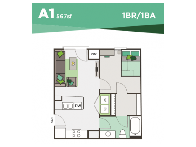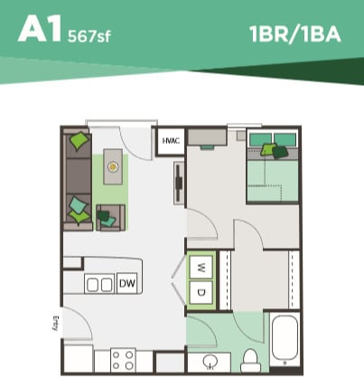 Modelo de apartamento: A1Desde $2,3751 Dormitorio, 1 Baño, 568 sq ftDisponible Ahora![]()