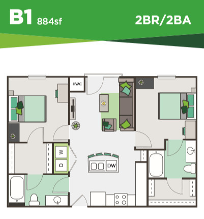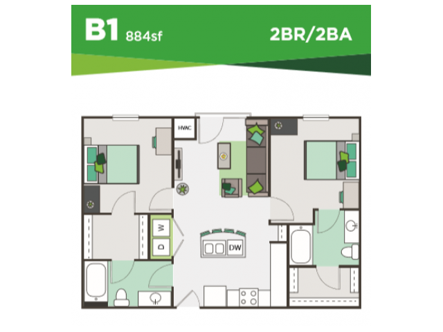 Modelo de apartamento: B2 SharedDesde $8392 Dormitorios, 2 Baños, 997 sq ftDisponible Ahora![]()