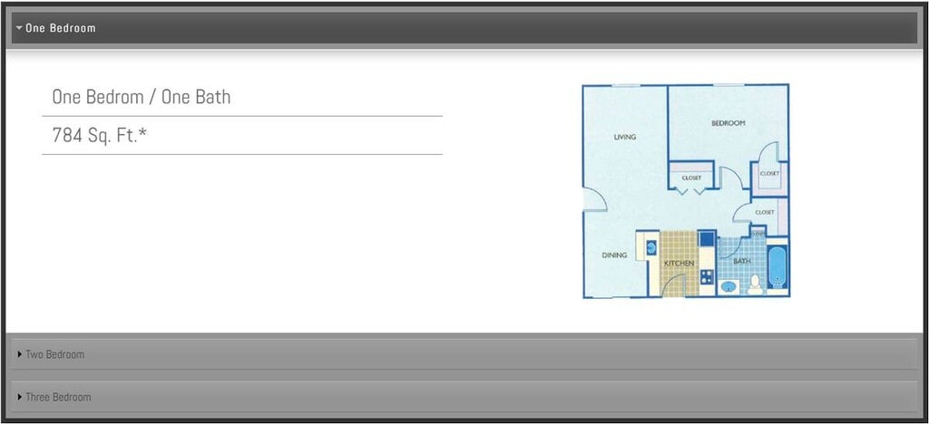 Modelo de apartamento: 1 Bedroom + 1 Bath1 Dormitorio, 1 Baño, 784 sq ftNo Disponible![]()