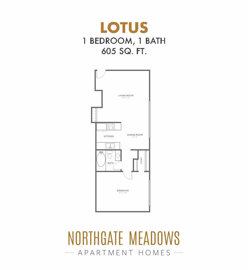 1 Dormitorio, 1 Baño, 605 pies²Disponible AhoraGalería del Modelo