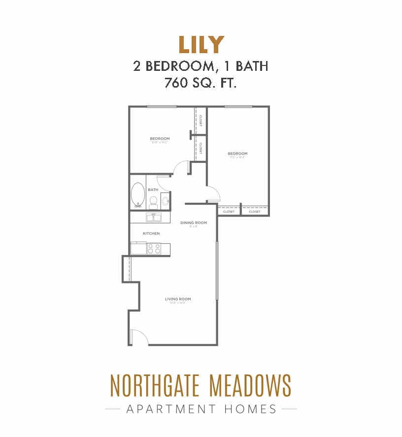2 Dormitorios, 1 Baño, 760 pies²Disponible AhoraGalería del Modelo