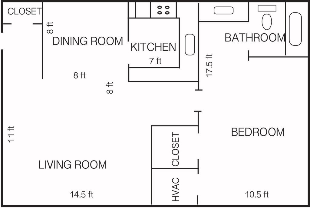 1 Bed, 1 bath - Plano 1 2 Dormitorios