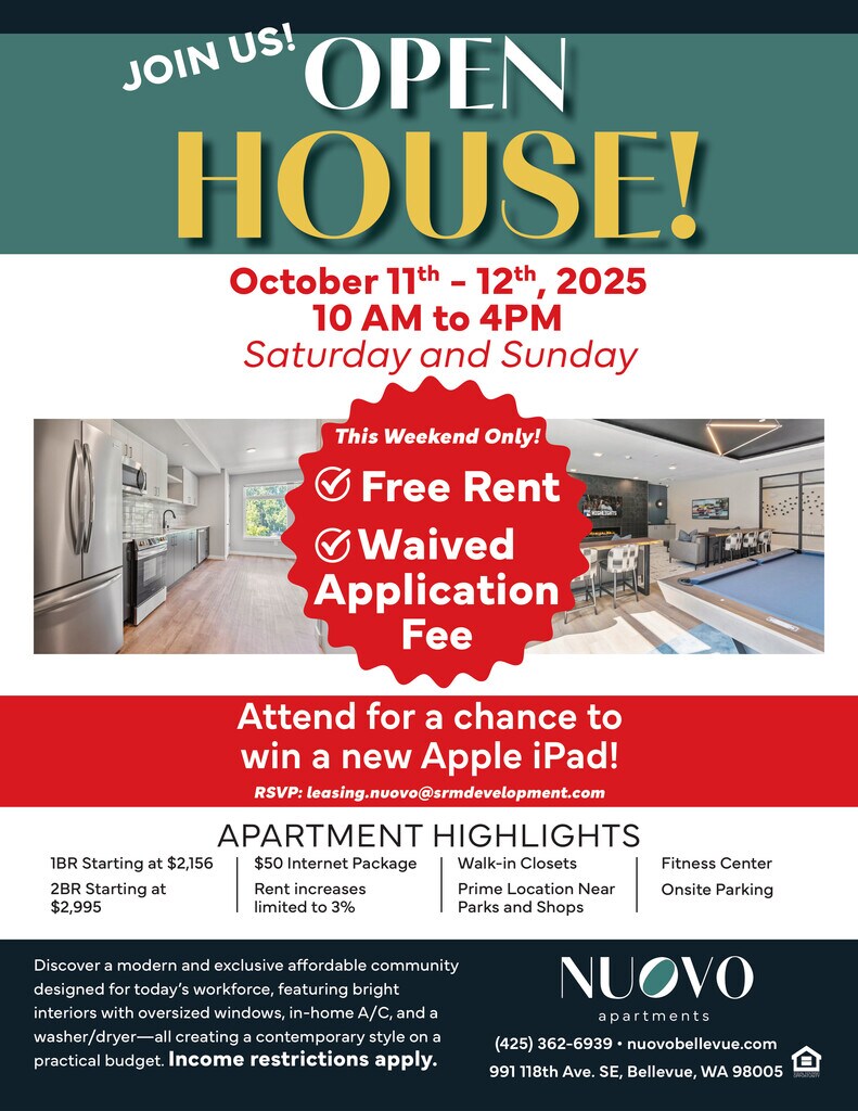 Nuovo Apartments, a vibrant new community developed and managed by SRM in partnership with Microsoft, brings 135 thoughtfully designed apartments in the heart of Bellevue. Offering spacious 1- and 2-bedroom layouts for individuals and families earning 80% to 100% of the Area Median Income (AMI), Nuovo combines comfort, style, and accessibility.Residents will enjoy a suite of exceptional amenities, including a modern fitness and yoga studio, a welcoming community room, an inviting outdoor courtyard with BBQ, a playground, and moredesigned to foster connection, wellness, and relaxation.Applications open April 1st, with move-ins beginning July 2025. Your next chapter starts here.