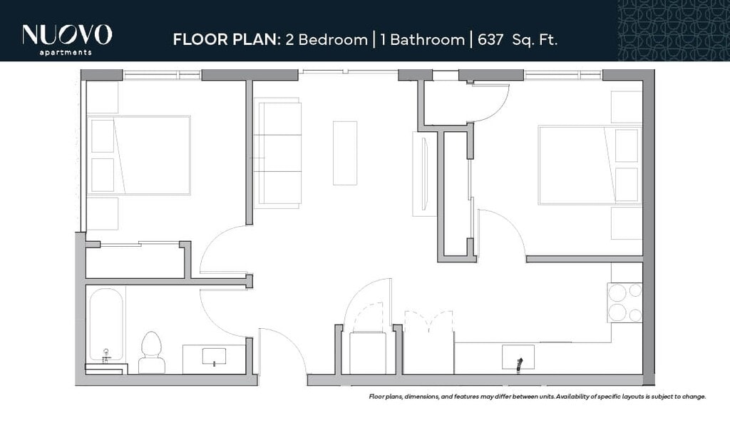 2 Dormitorios, 1 Baño, 637 pies²Disponible AhoraGalería del Modelo