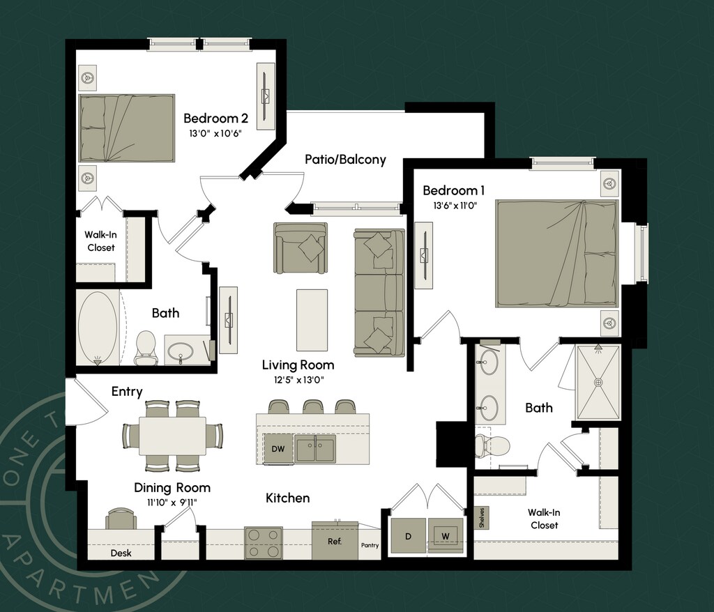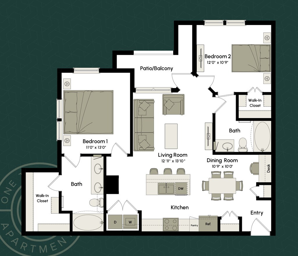 Modelo de apartamento: B32 Dormitorios, 2 Baños, 1016 sq ftDisponible December 6, 2025![]()