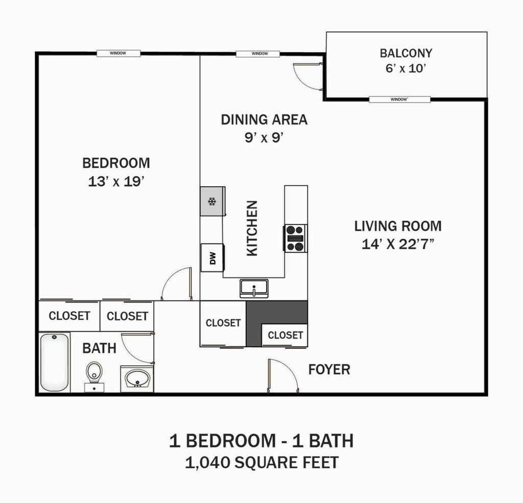 1 Dormitorio, 1 Baño, 1040 pies²El más grandeEsta opción tiene las unidades más grandes para este modeloGalería del Modelo