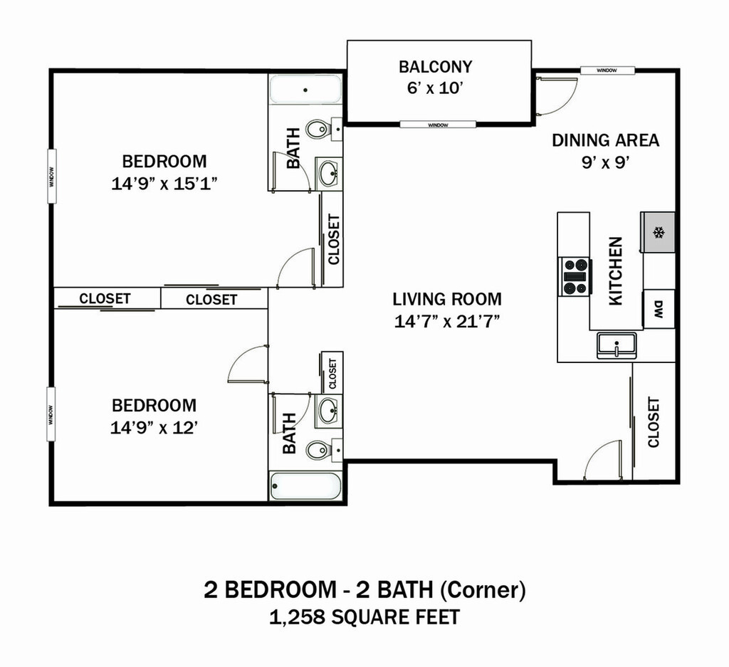 Modelo de apartamento: 2 Bedroom 2 Bath Corner2 Dormitorios, 2 Baños, 1258 sq ftDisponible January 31, 2026![]()