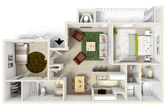 Modelo de apartamento: B1 Renovated2 Dormitorios, 2 Baños, 940 sq ftDisponible Ahora![]()