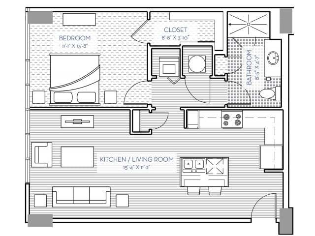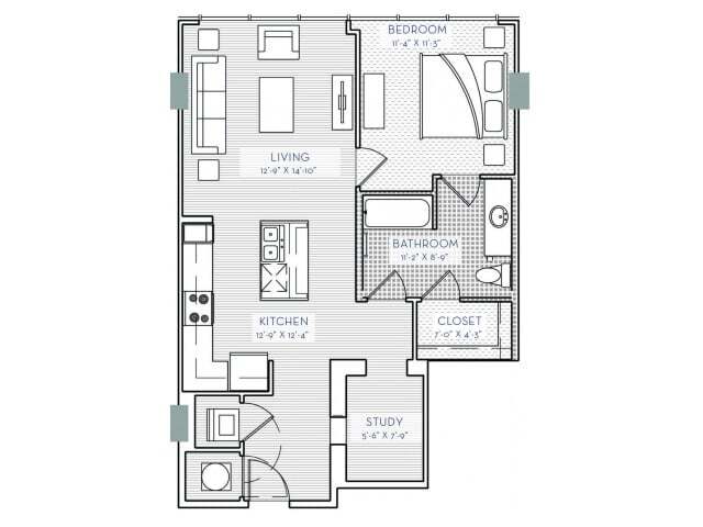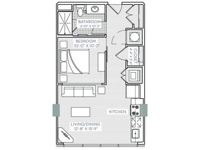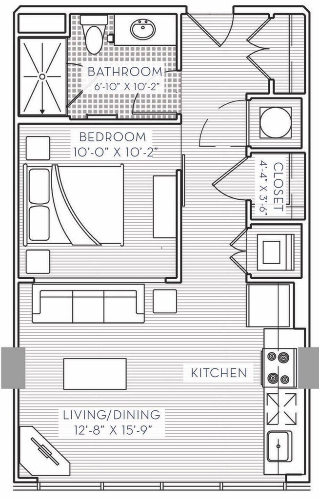 Modelo de apartamento: StudioDesde $1,615Estudio, 1 Baño, 593 sq ftDisponible December 12, 2025PlanosFotos![]()