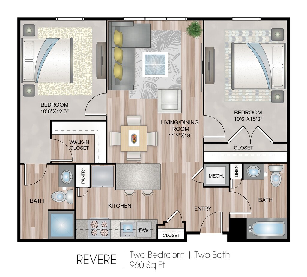 Revere - Plano 1 Unidad de apartamento: 01-108Modelo de apartamento: RevereDesde $2,7912 Dormitorios, 2 Baños, 960 sq ftDisponible Ahora
