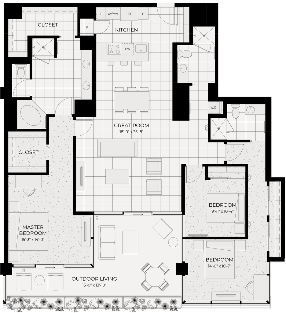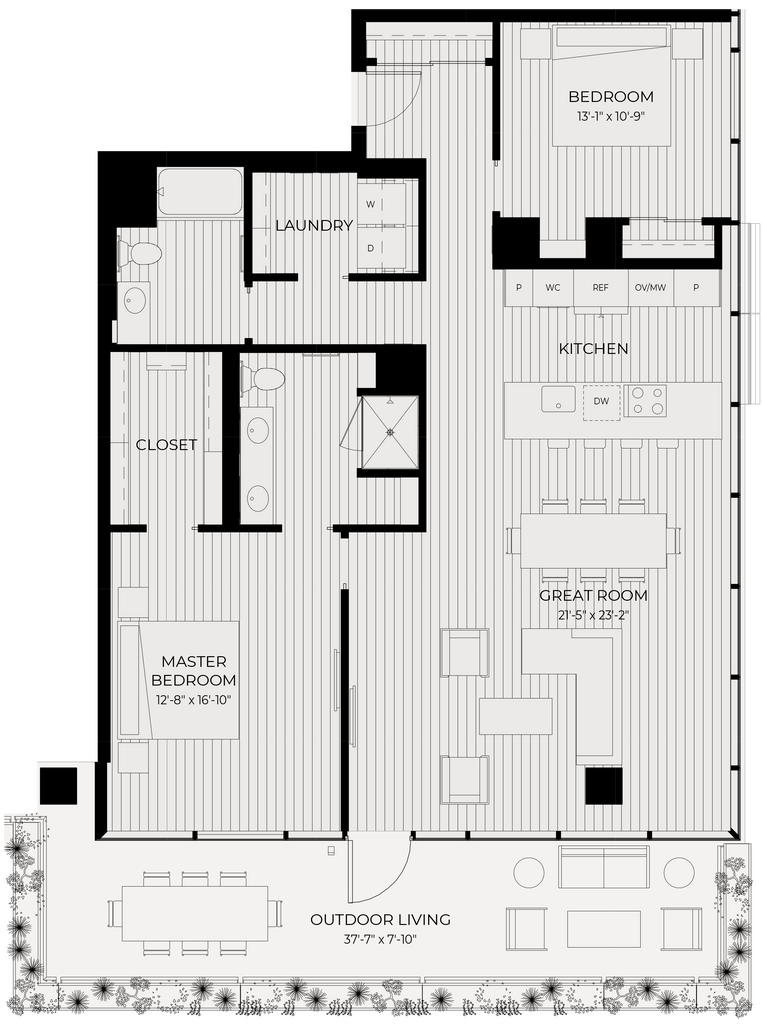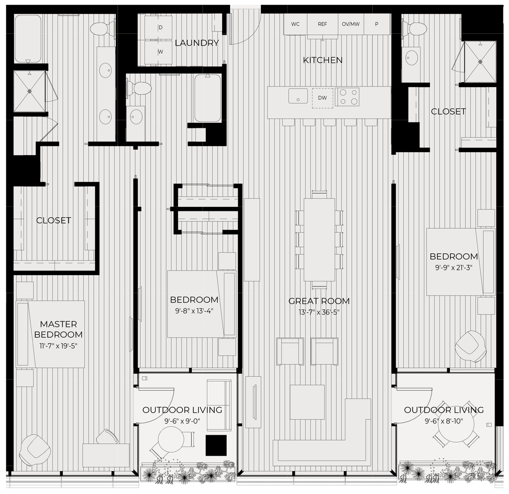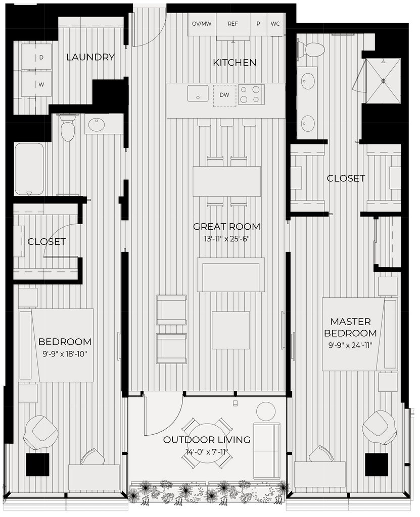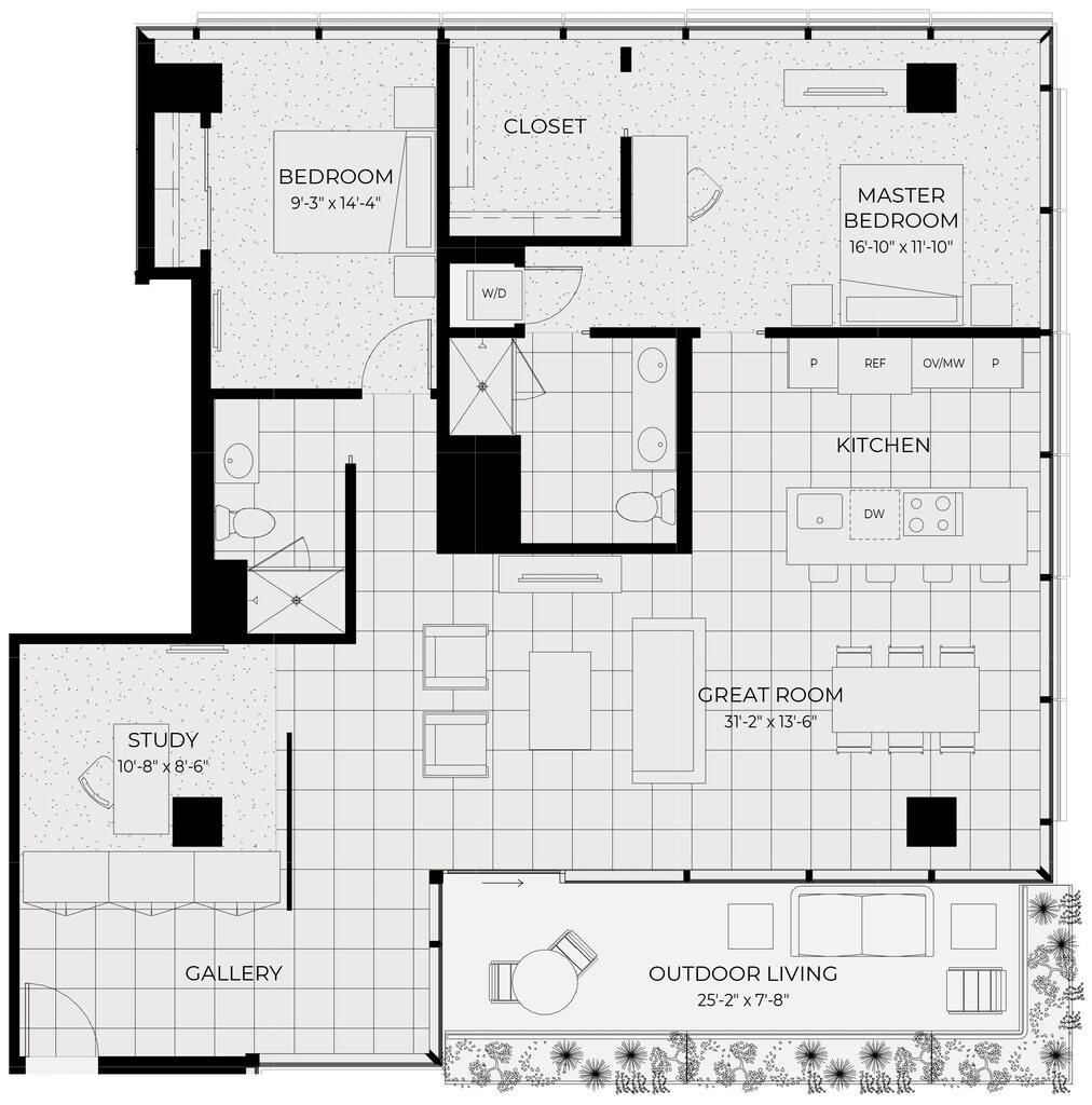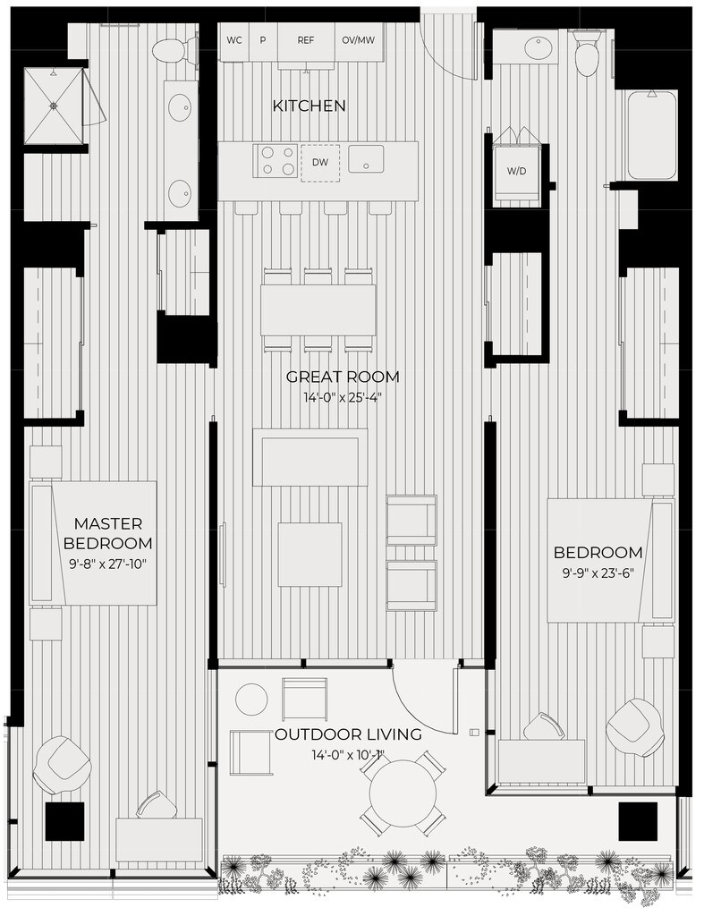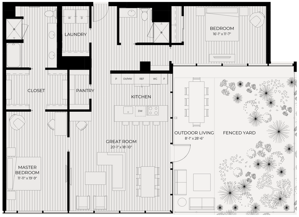 1 Dormitorio, 1 Baño, 820-835 pies²Disponible AhoraGalería del Modelo