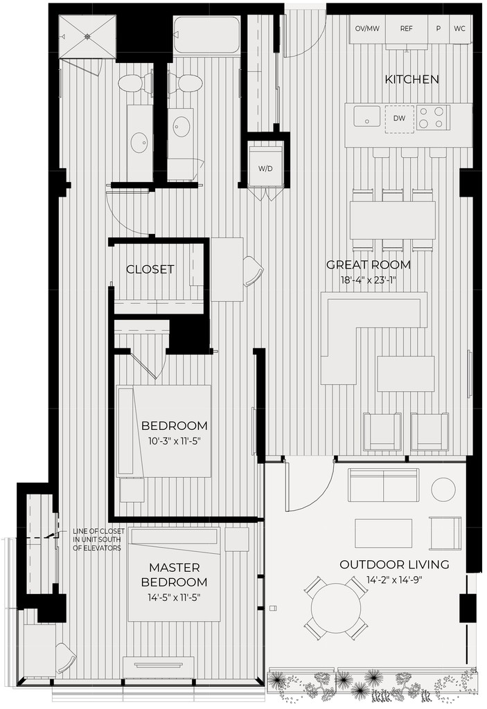 Stetson - Plano 1 Unidad de apartamento: 95-2002Modelo de apartamento: Stetson1 Dormitorio, 1 Baño, 846 sq ftDisponible AhoraCamelvista