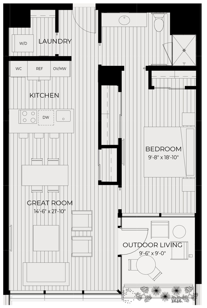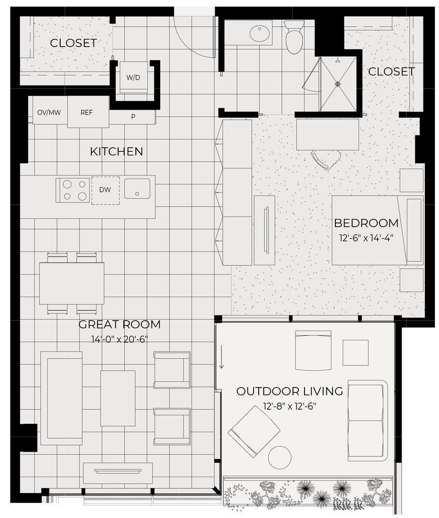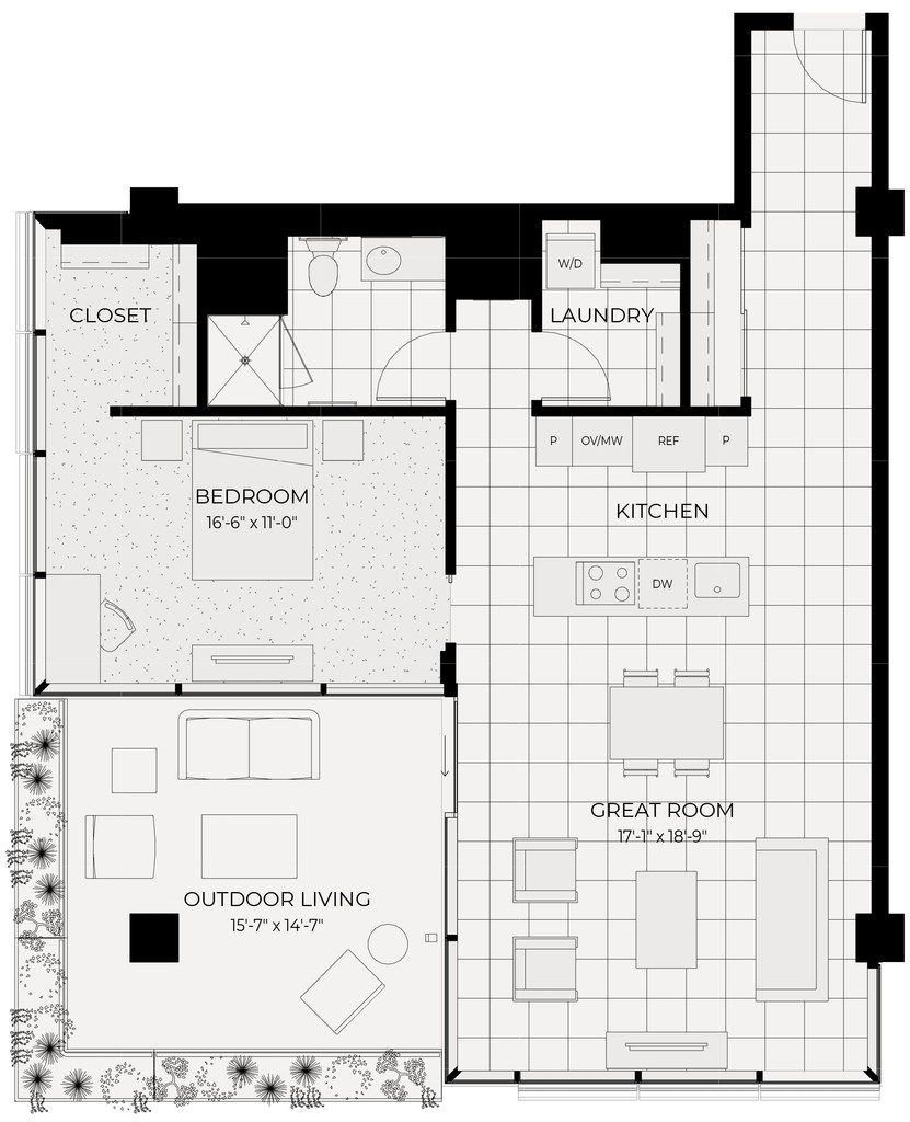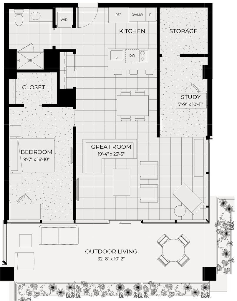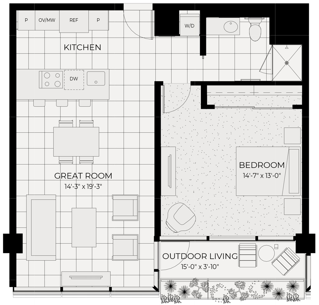1 Dormitorio, 1 Baño, 805-892 pies²Disponible AhoraGalería del Modelo