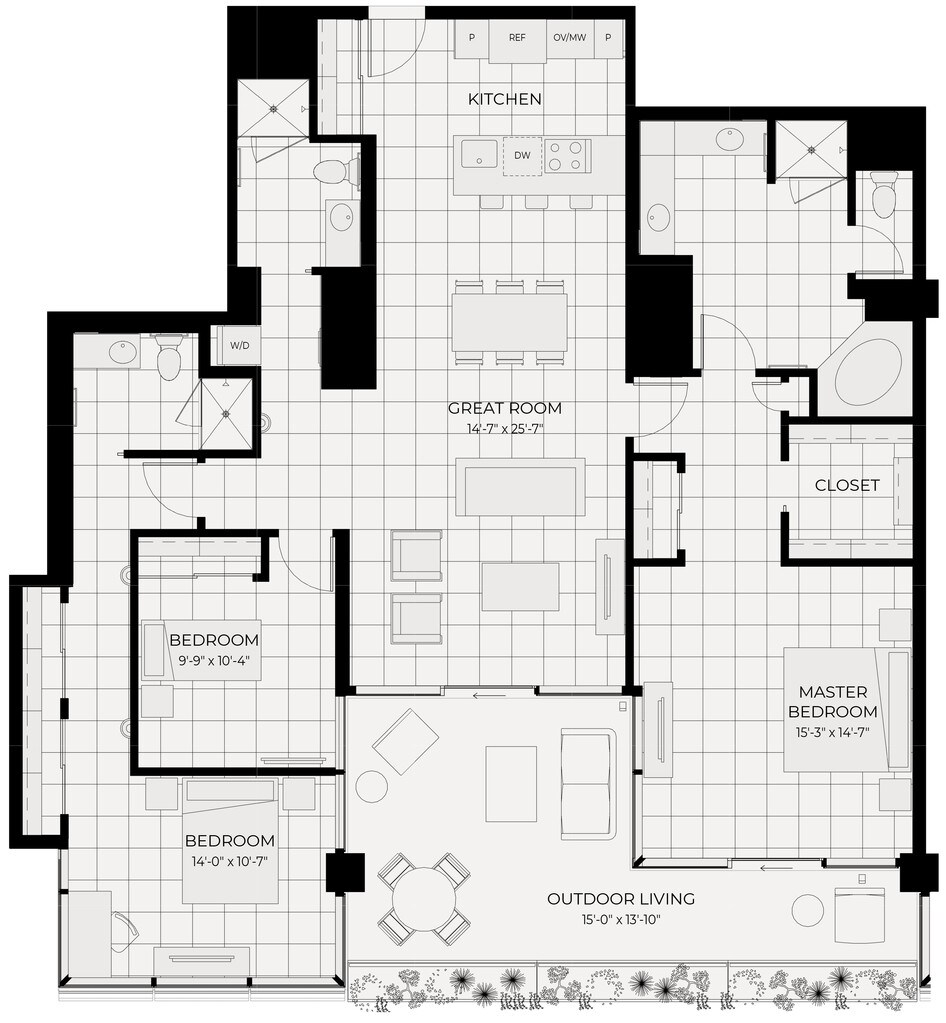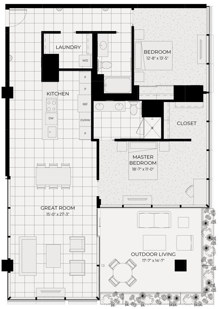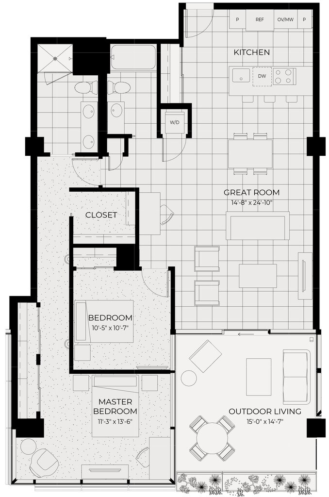 Modelo de apartamento: Stetson1 Dormitorio, 1 Baño, 846 sq ftDisponible Ahora![]()