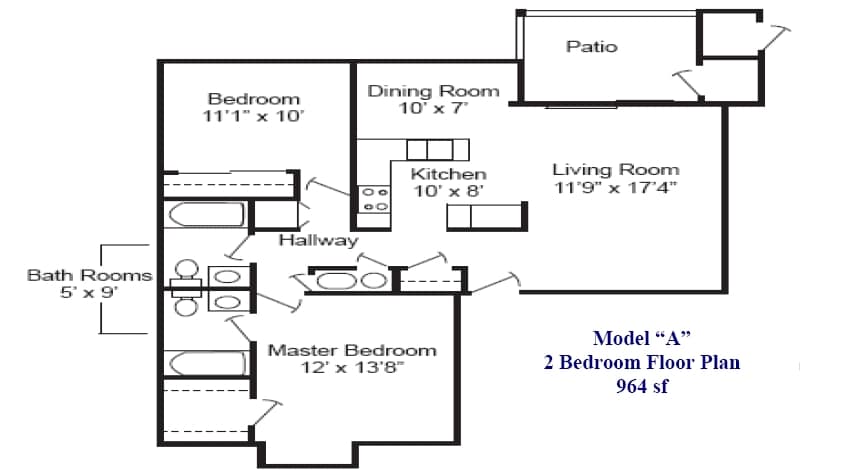 Modelo de apartamento: A2 Dormitorios, 2 Baños, 964 sq ftNo Disponible![]()