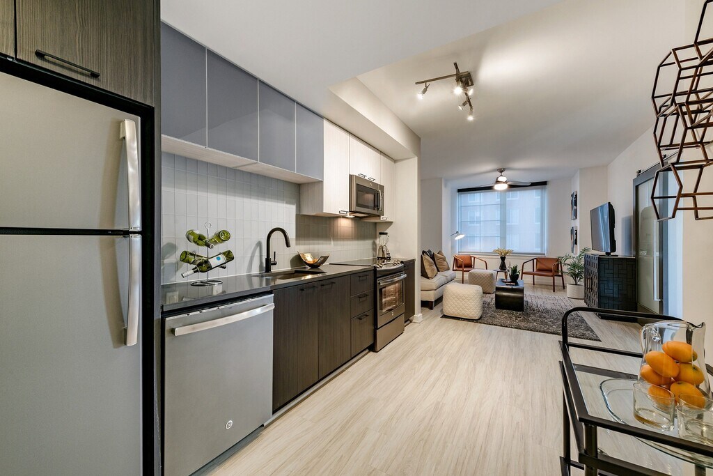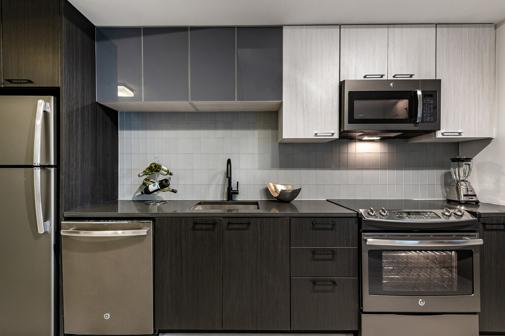 - Gabinetes modernos, encimeras de cuarzo y placas para salpicaduras de vidrio